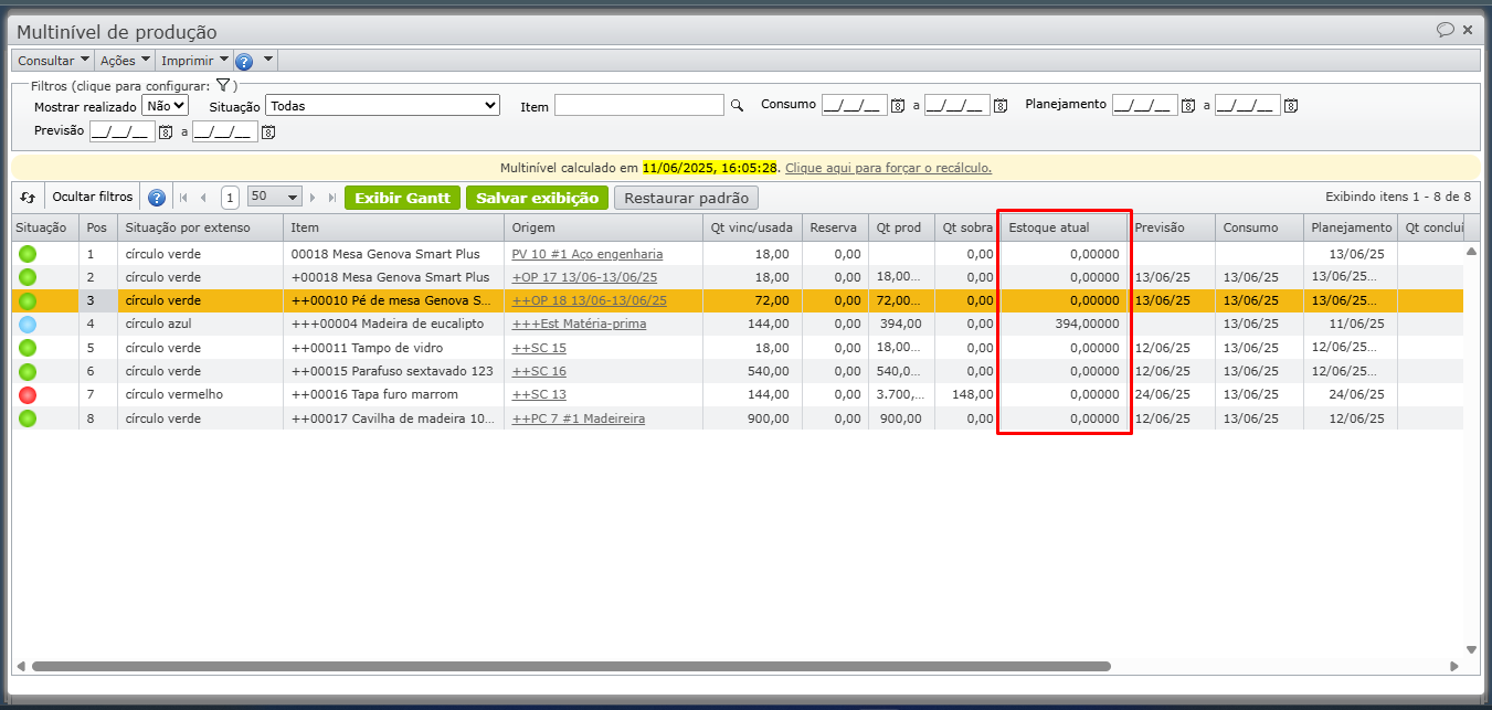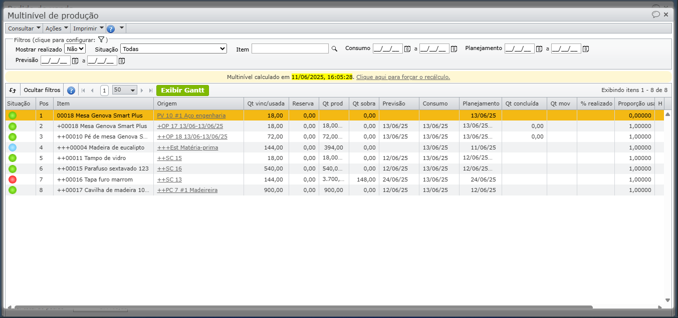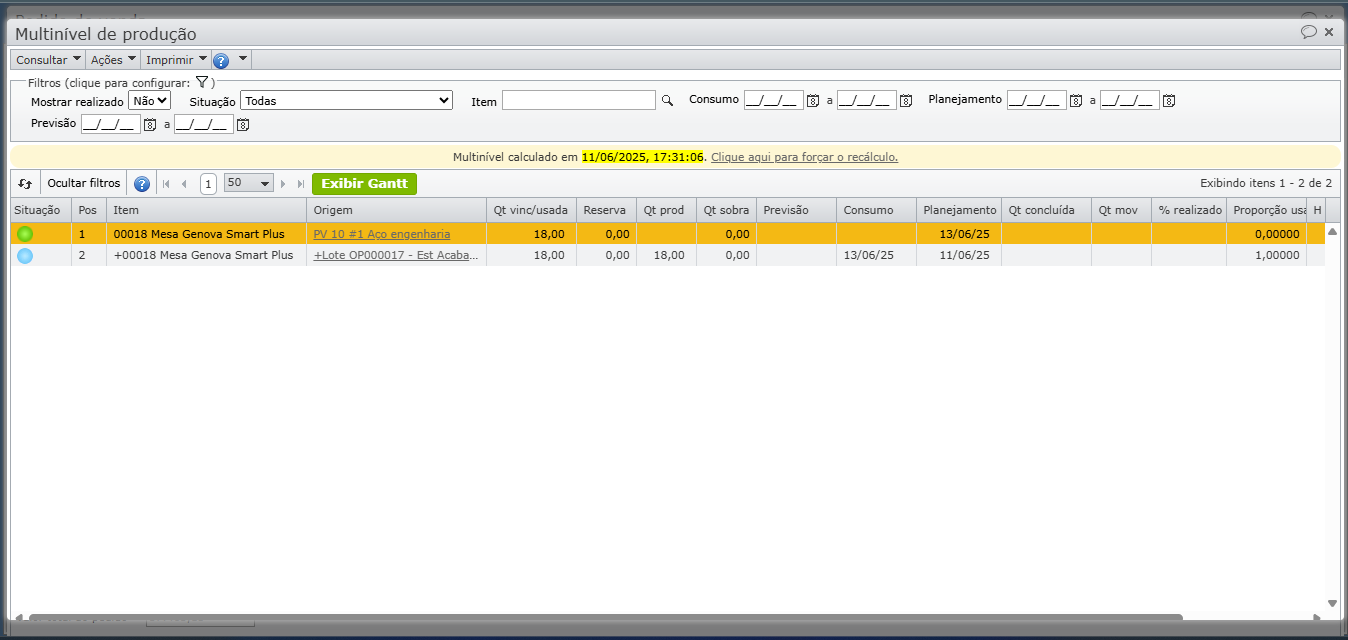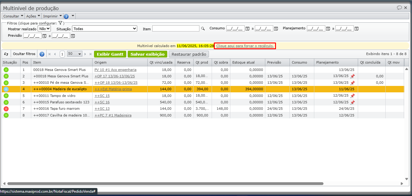 A tela exibe a data e hora do último recálculo. Para atualizá-la, clique em “Clique aqui para forçar o recálculo.”. Observação: para assegurar a atualidade da situação da produção (multinível), deve-se rodar o MRP antes da exibição. Não é necessário fazer isso a cada exibição, mas é bom manter em mente que, sem executar o MRP, aquilo que é exibido pode não refletir as últimas alterações ocorridas.