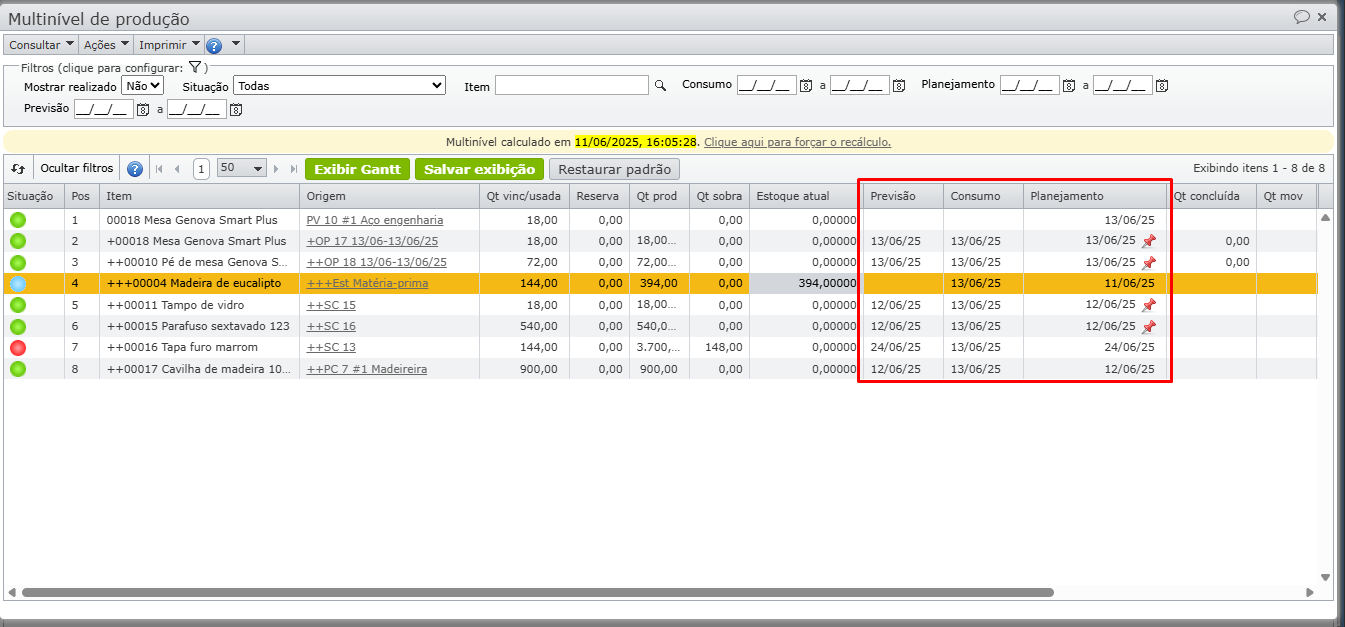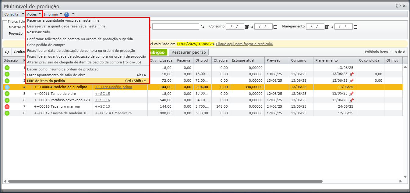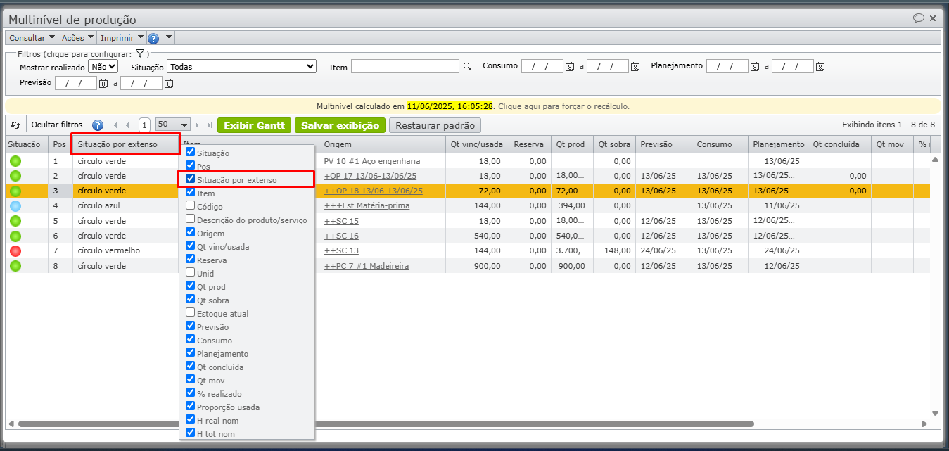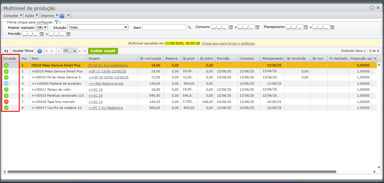 A tela exibe a data e hora do último recálculo. Para atualizá-la, clique em “Clique aqui para forçar o recálculo.”. Observação: para assegurar a atualidade da situação da produção (multinível), deve-se rodar o MRP antes da exibição. Não é necessário fazer isso a cada exibição, mas é bom manter em mente que, sem executar o MRP, aquilo que é exibido pode não refletir as últimas alterações ocorridas.