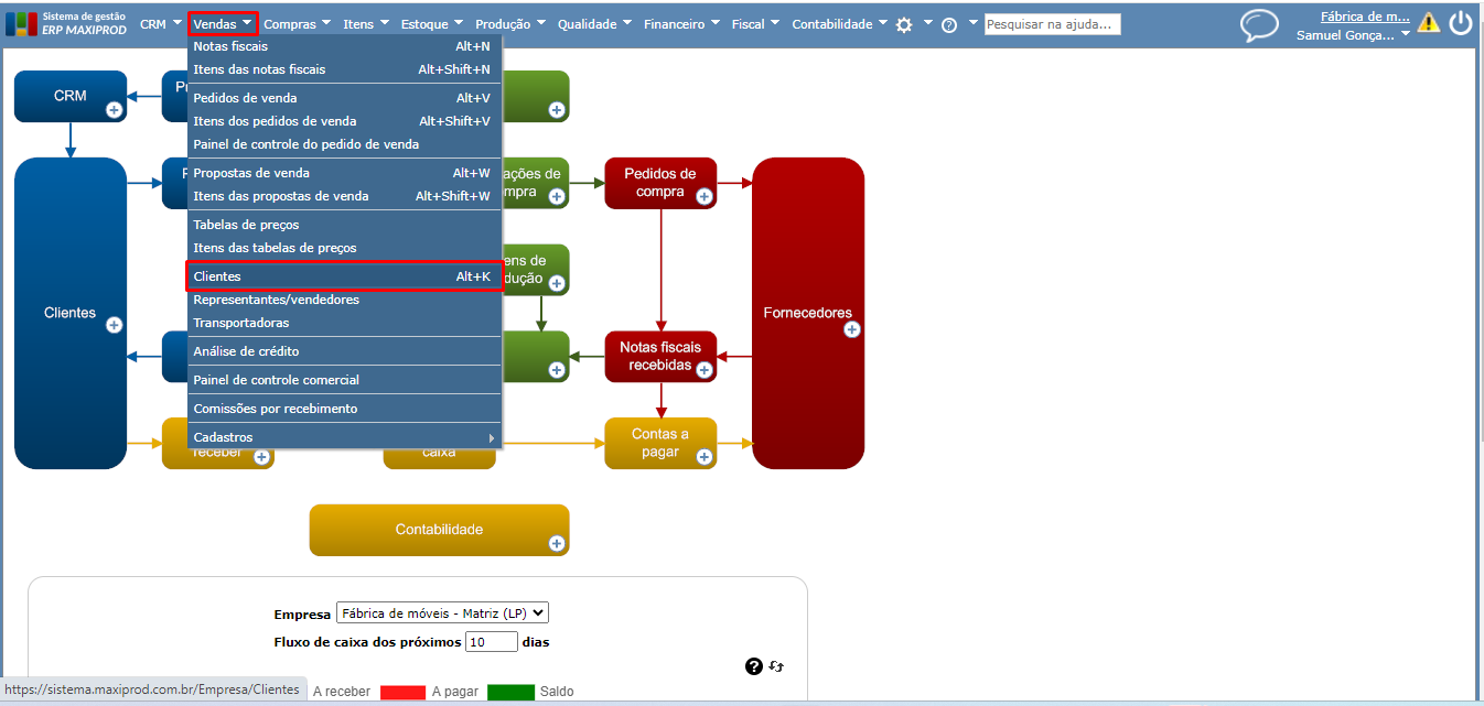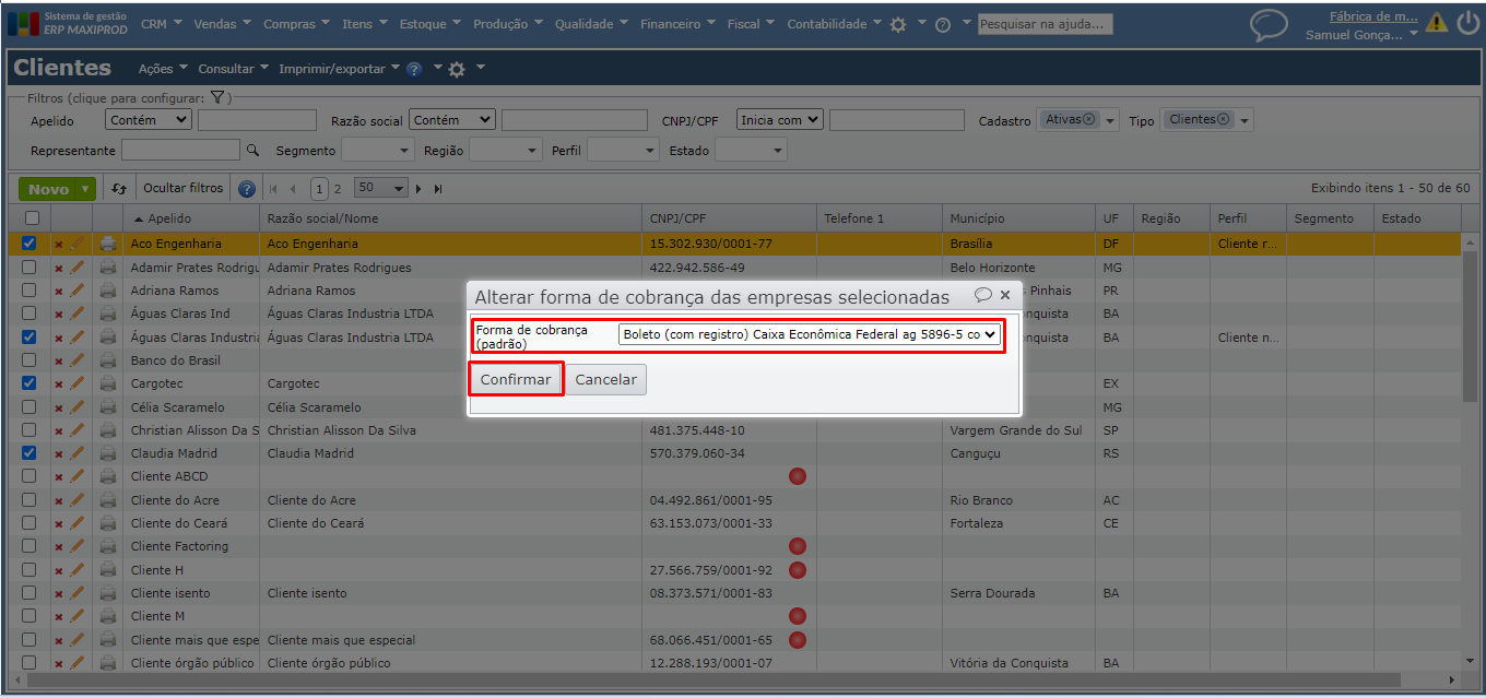 2) Para alterar em massa a forma de cobrança padrão do cadastro de várias empresas, acesse a grade de empresas pelo menu superior “Vendas > Clientes”.
