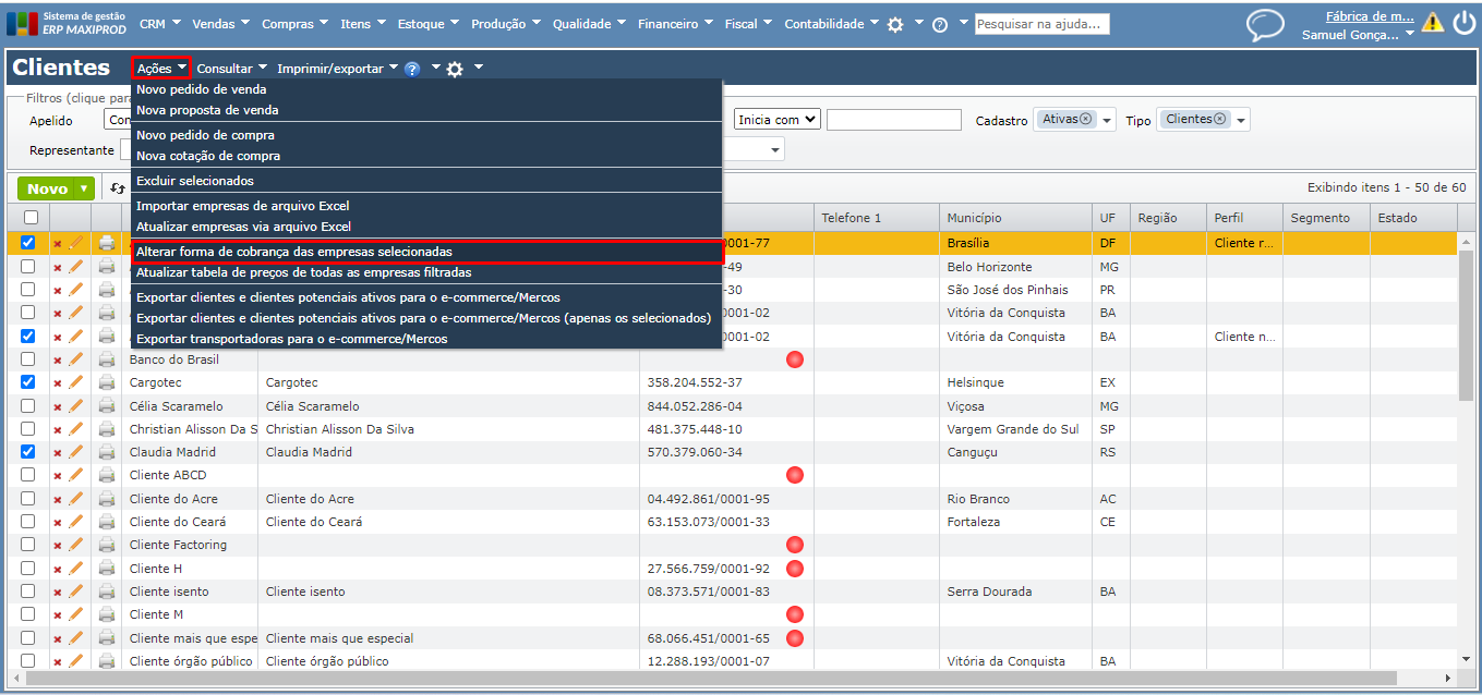 3) Marque a caixa de seleção das empresas que devem ter a forma de cobrança padrão alterada, e acesse o submenu “Ações > Alterar forma de cobrança das empresas selecionadas”.