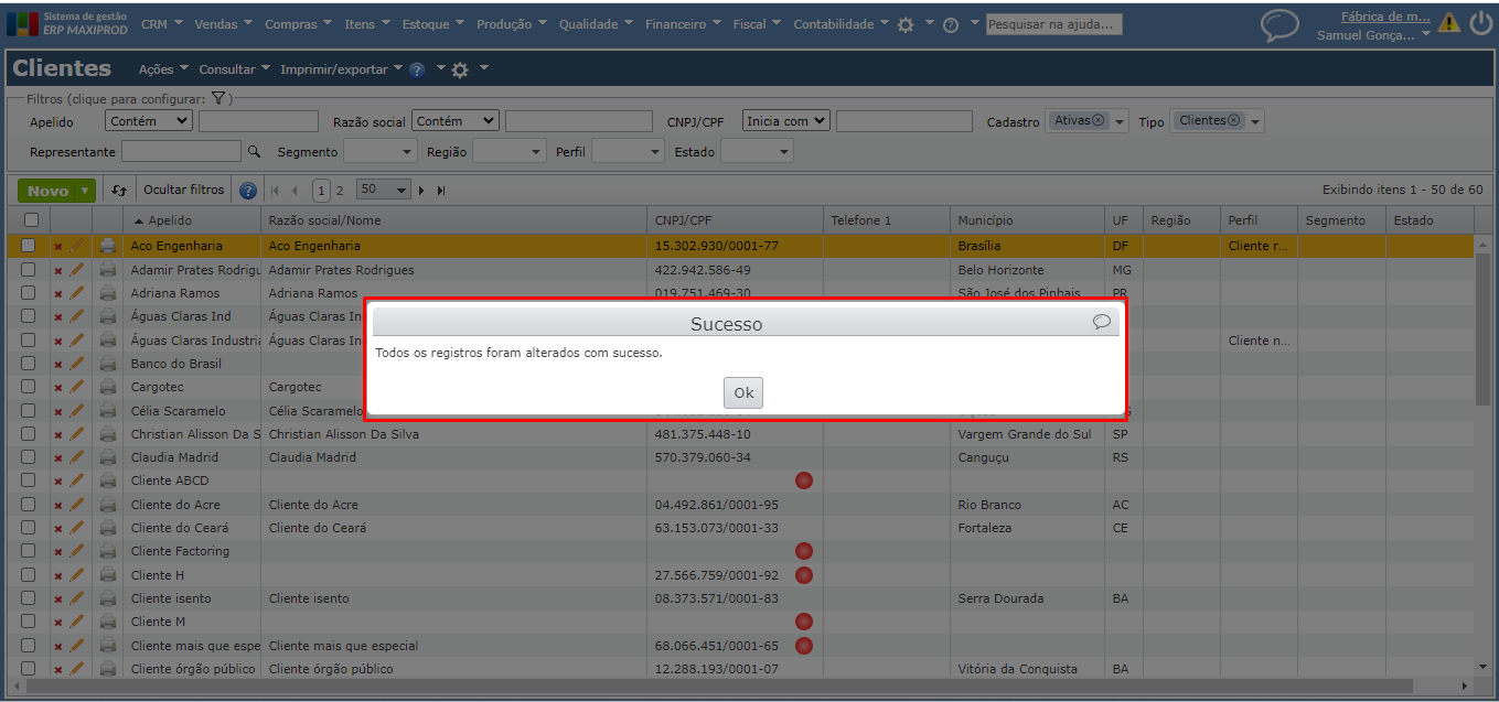 5) Se não houver impedimento para as alterações, ao final será exibida a mensagem: “Todos os registros foram alterados com sucesso.”