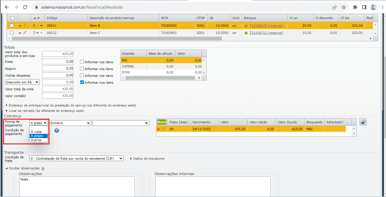 3) Na seção de cobrança, selecione uma das opções: “À vista” ou “A prazo”.