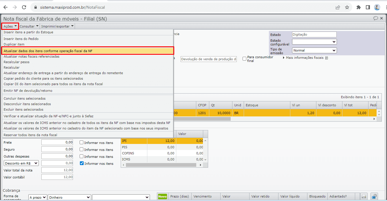 2) Se a opção “com pagamento” não estava marcada na operação fiscal, então é necessário atualizar os itens da NF. Para isso, na edição da NF, vá ao menu “Ações > Atualizar dados dos itens conforme operação fiscal da NF”.