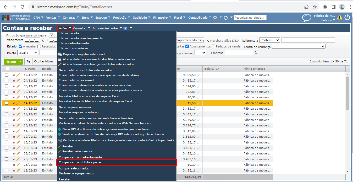 6) Na tela de contas a receber, selecione o título da NF original (clicando na linha do título) e vá ao menu “Ações > Compensar com título a pagar”.