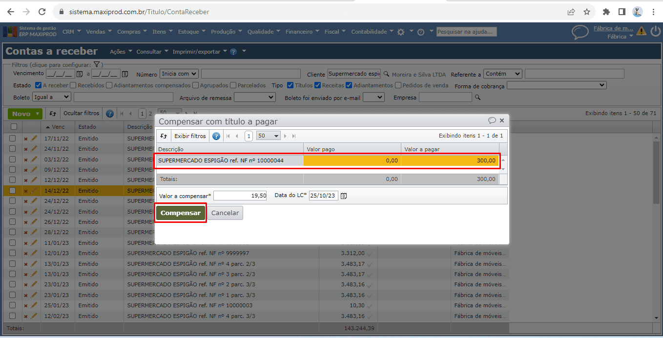 7) Selecione o título da NF-e de devolução de venda e clique no botão verde “Compensar”.