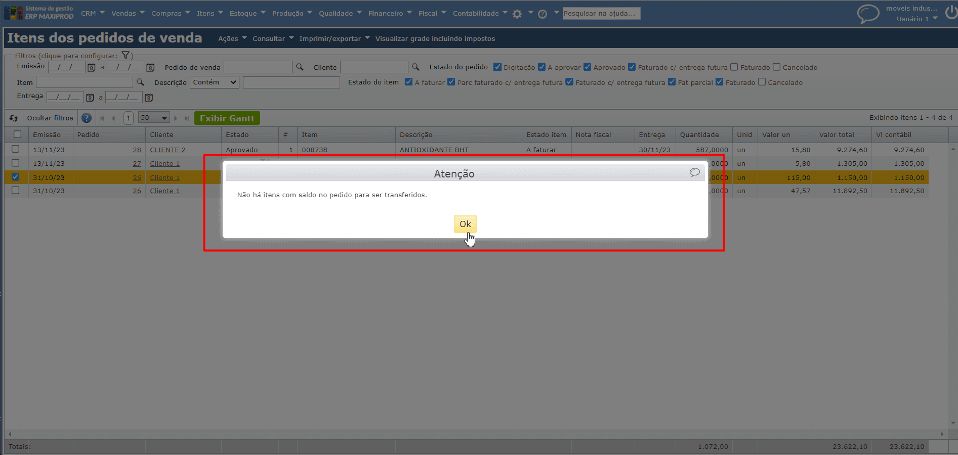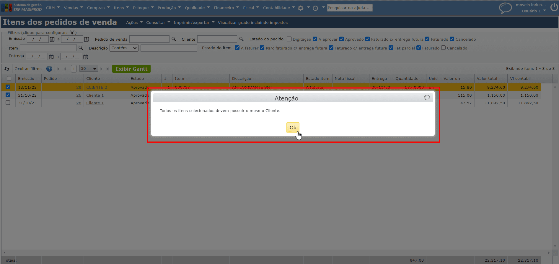 - Apenas itens de pedidos de venda emitidos para o mesmo cliente podem ser incluídos no faturamento. Caso contrário, o sistema retornará uma mensagem de “Atenção” com botão “Ok“, e o faturamento não será realizado.