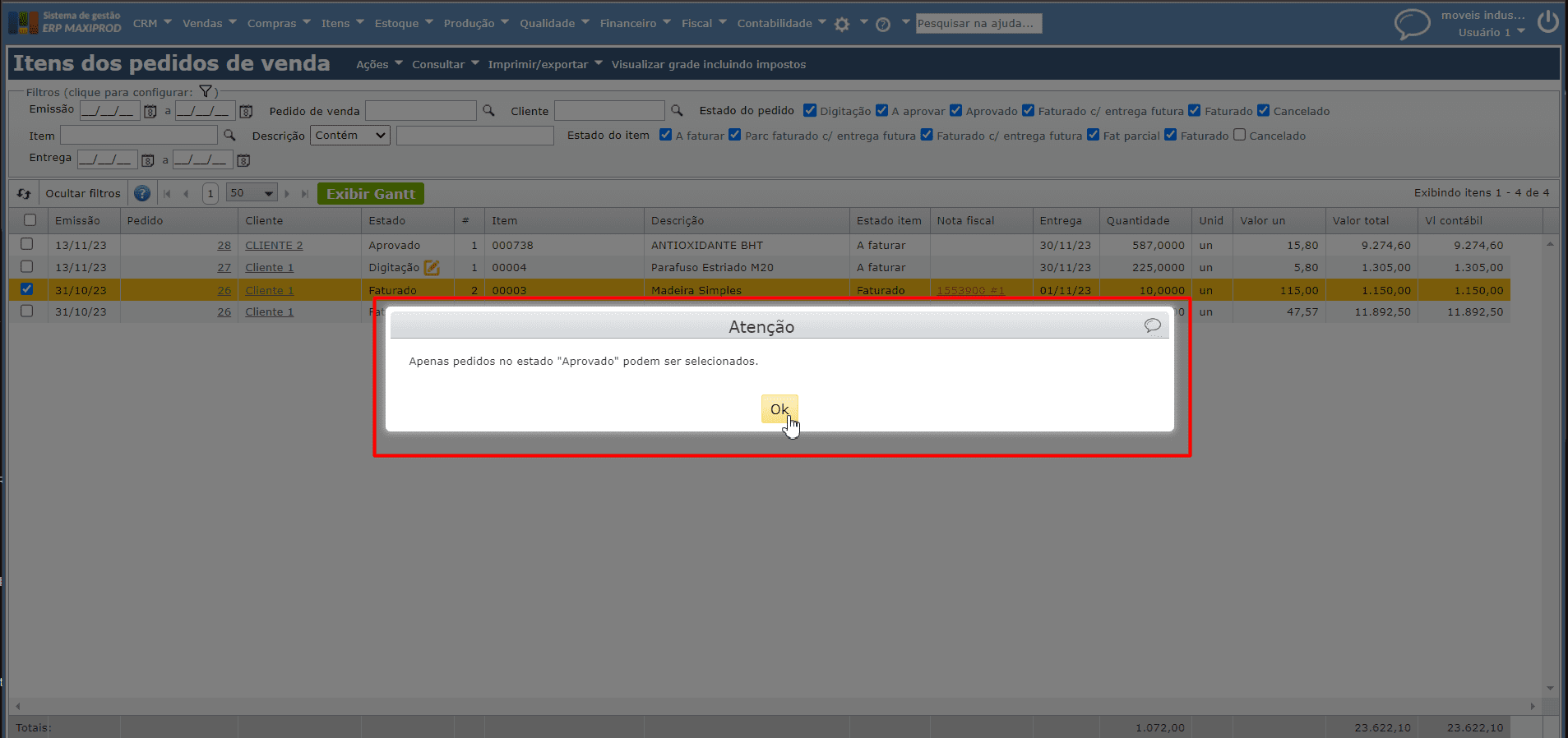 - Se o estado do pedido de venda for diferente de “Aprovado“, o sistema não permitirá que os itens sejam faturados, retornando uma mensagem de “Atenção” com botão “Ok“, e o faturamento não será realizado.