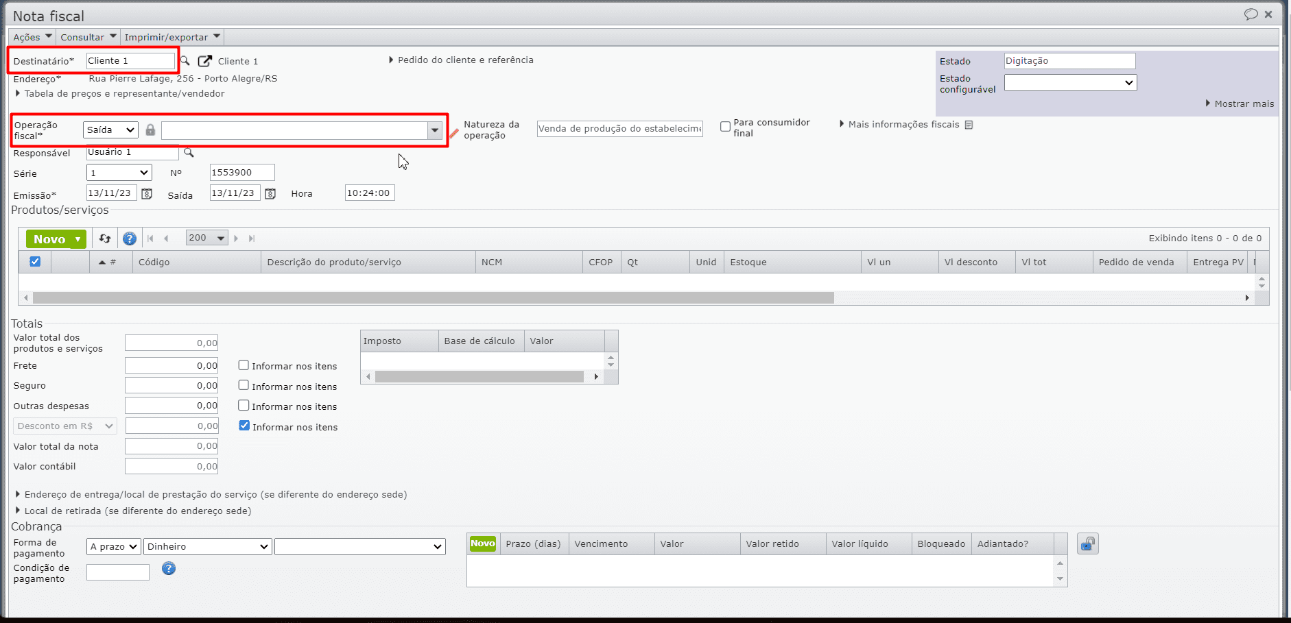 - Caso tenha criado uma nova NF, selecione o cliente em “Destinatário” e a operação fiscal em “Operação fiscal“.