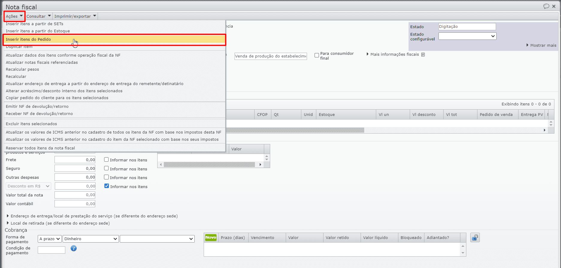 3) Acesse o menu “Ações > Inserir itens do Pedido”.