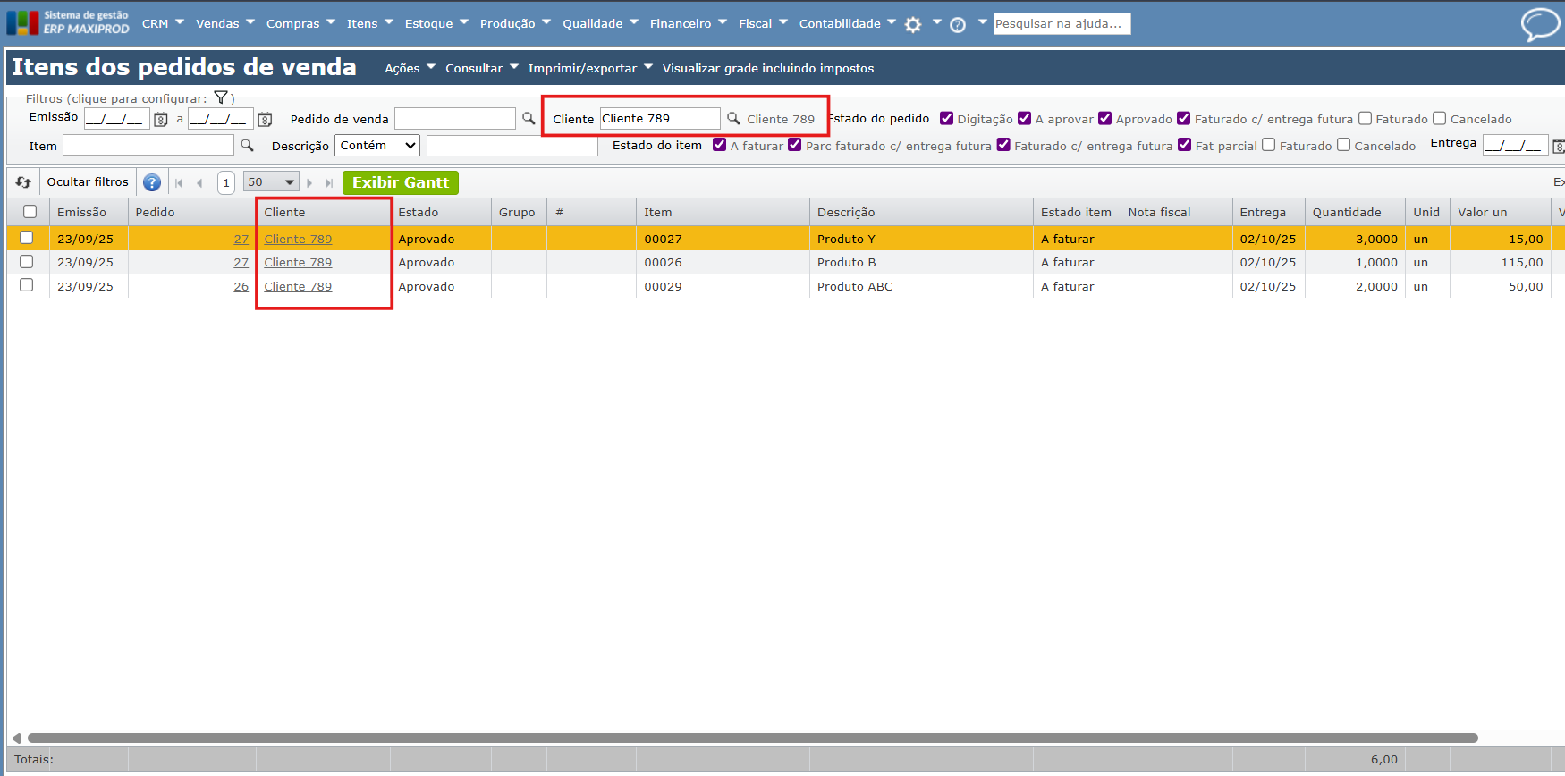 2) Utilize o filtro “Cliente” para identificar os itens dos pedidos do mesmo cliente.