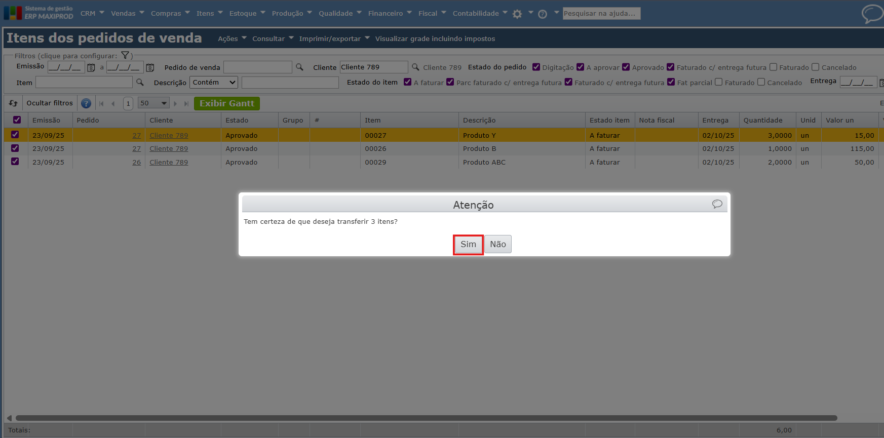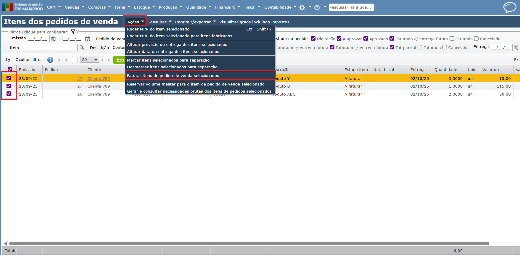 Este exemplo mostra como faturar os itens dos pedidos de venda a partir da tela “Itens dos pedidos de venda”, gerando uma única NF.