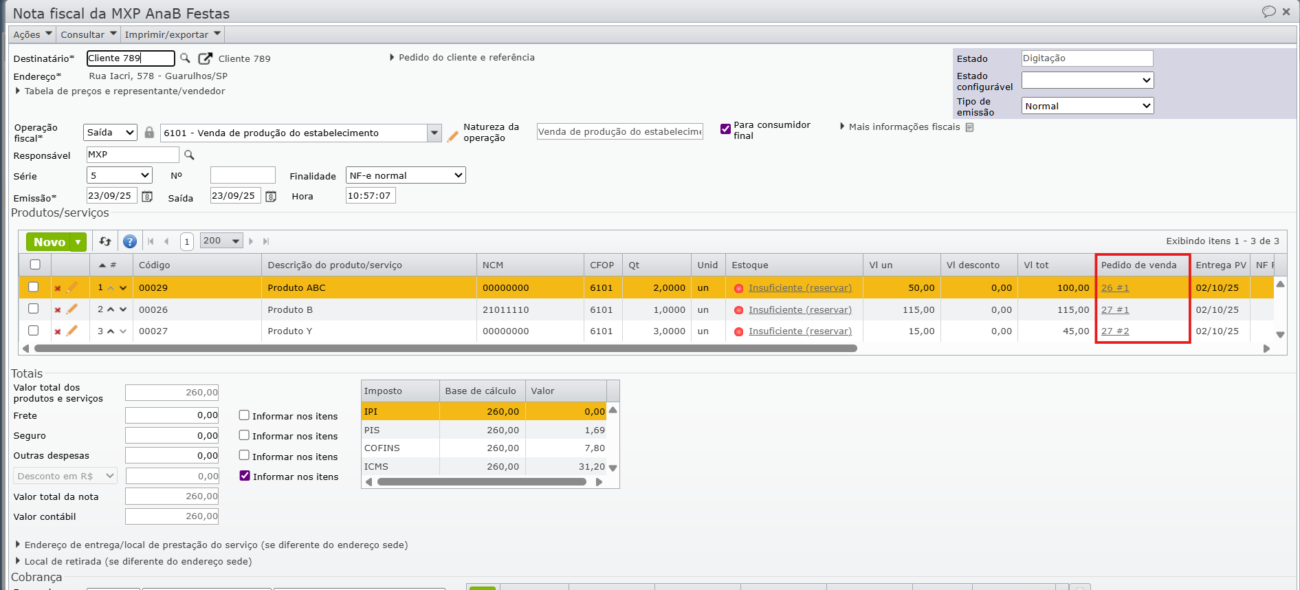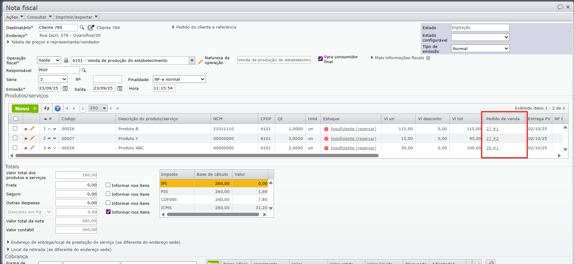 5) A NF será criada, sendo o vínculo com os pedidos visível na coluna “Pedido de venda” da grade de itens.