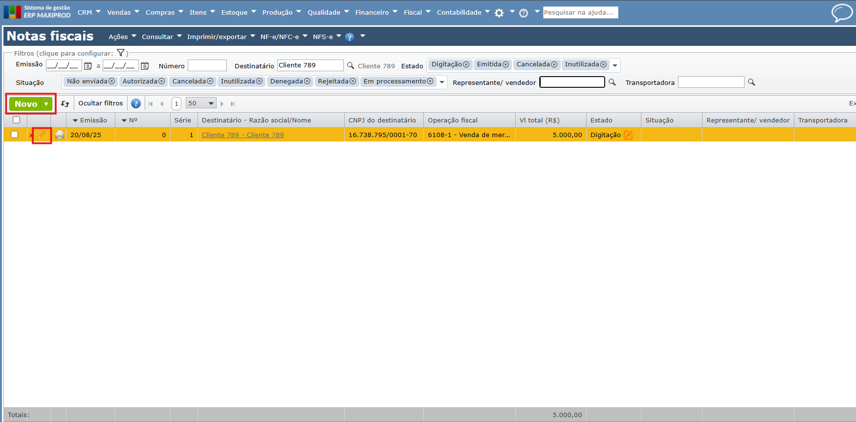 2) Identifique a NF na qual deseja inserir os itens de diferentes pedidos e clique no ícone “lápis laranja” (a nota deve estar no estado “Digitação”), ou crie uma nova NF clicando no botão verde “Novo“.