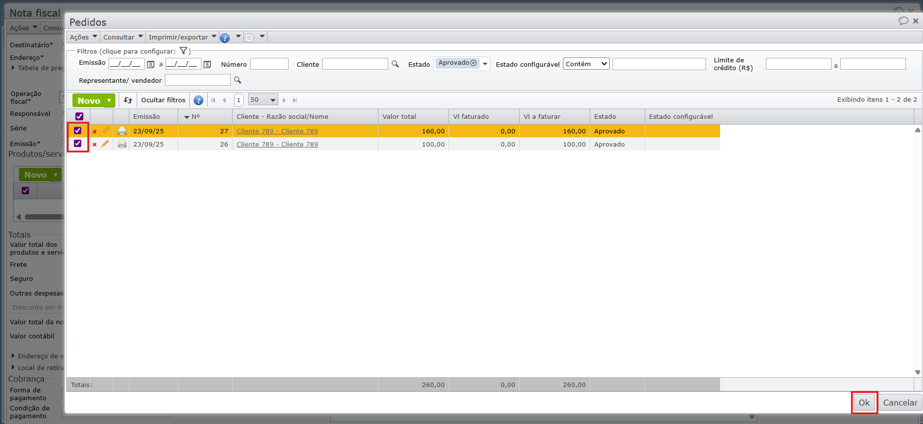 4) É aberta uma tela auxiliar, que exibe todos os pedidos do destinatário em estado “Aprovado“. Selecione os pedidos marcando as caixas de seleção, e clique no botão cinza “Ok“.