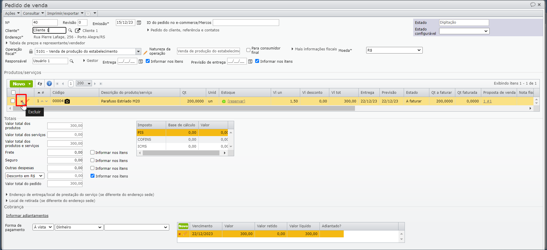 a) Na tela de edição do pedido, clique no ícone “x vermelho” do item vinculado, para excluí-lo.