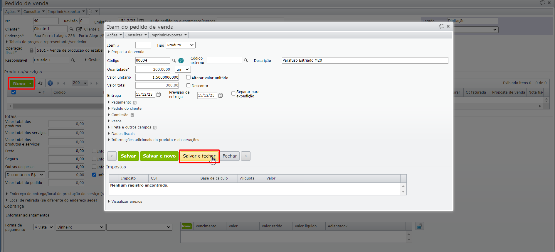 b) A seguir, clique no botão verde “Novo” e selecione novamente o item, complete as demais informações e clique no botão cinza “Salvar e fechar“.