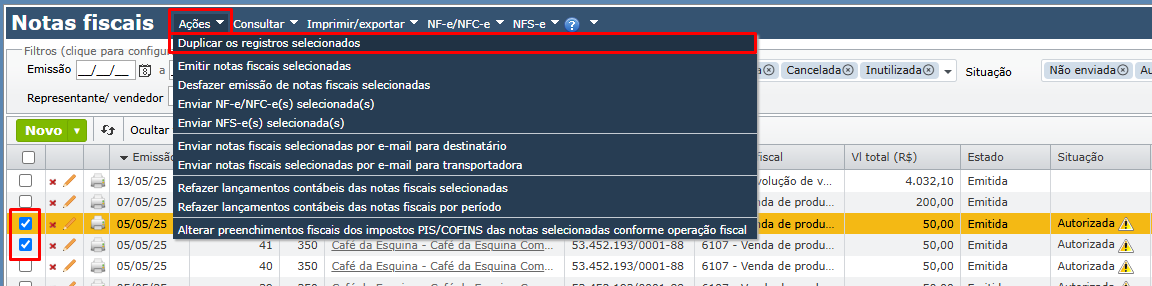 - Emissão: em todos os registros, a data de emissão é alterada para a data da duplicação.