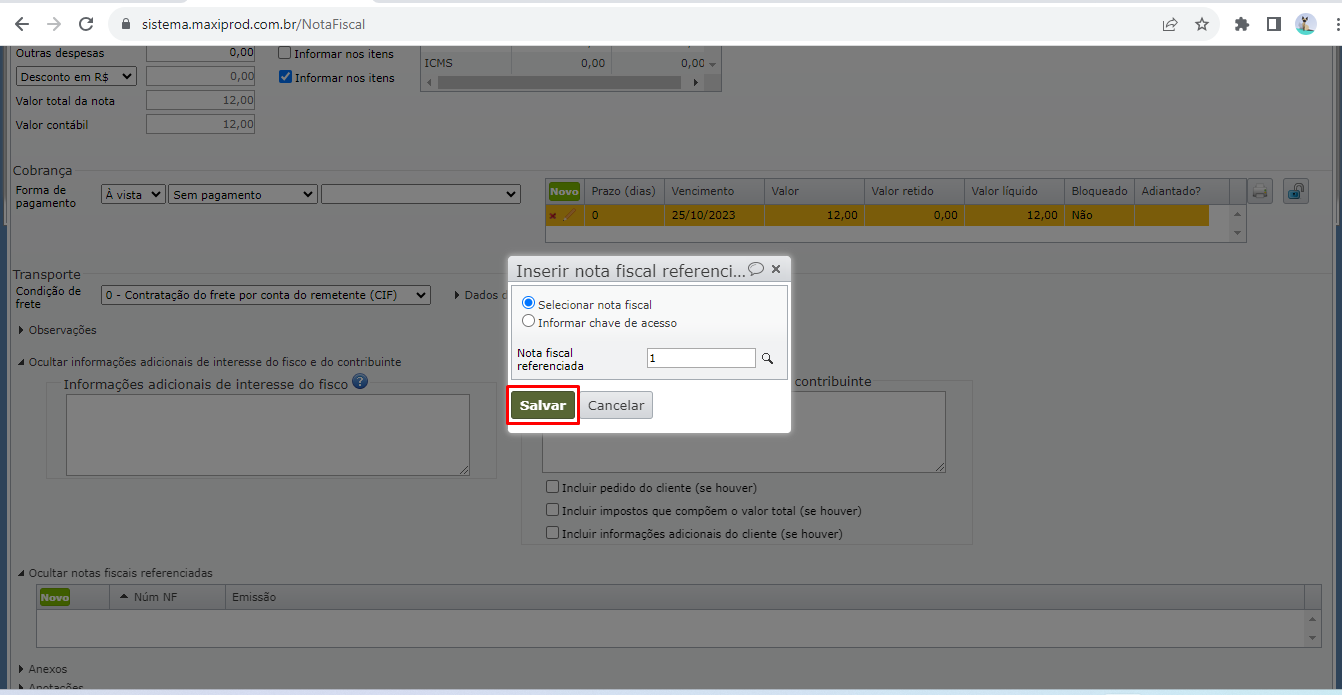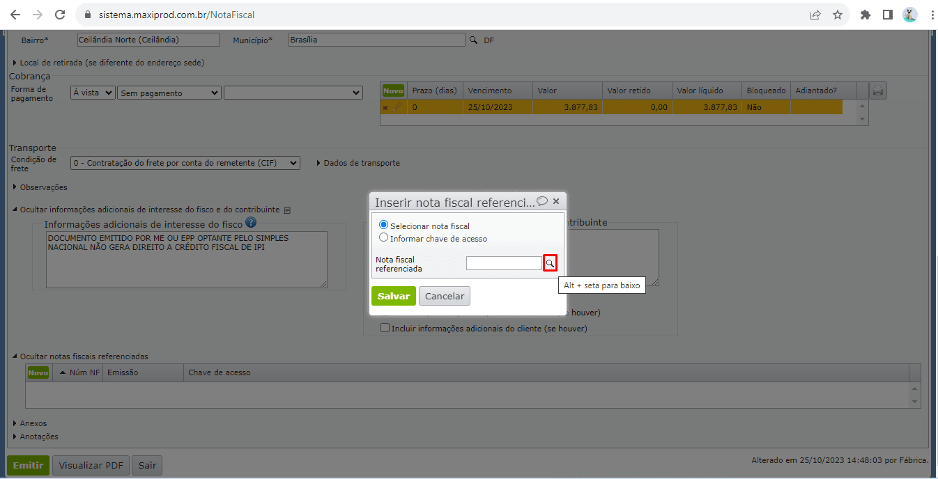 a) clique no ícone da lupa ao lado do campo “Nota fiscal referenciada” para buscar a NF referenciada na lista de NFs emitidas e recebidas no sistema.