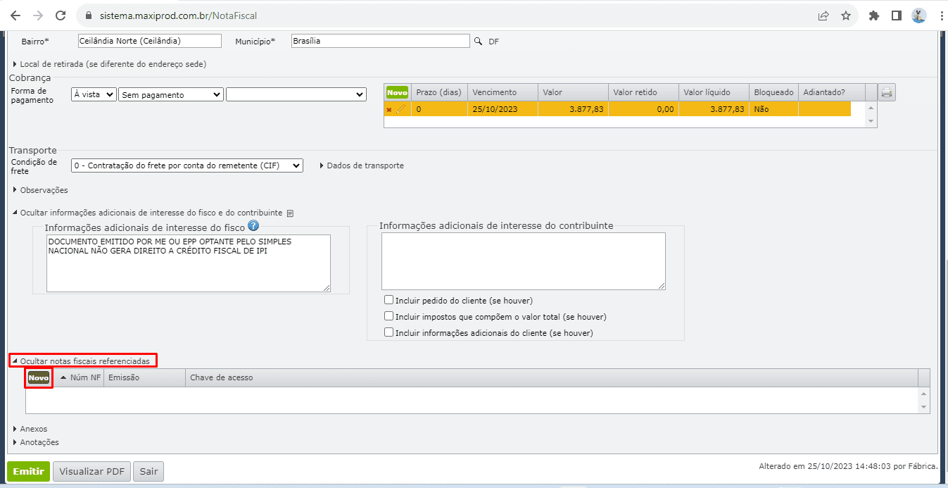 4) Ao final da NF, expanda a opção “Notas Fiscais Referenciadas” e clique no botão verde “Novo”.