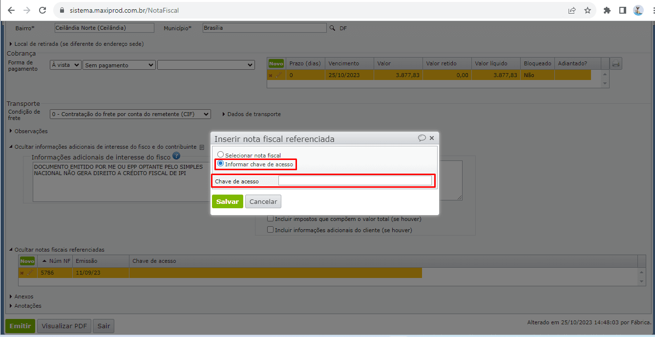 5) Selecione a opção “Informar chave de acesso”. Digite as chaves das NFs originais e clique em “Salvar” para guardar as alterações.