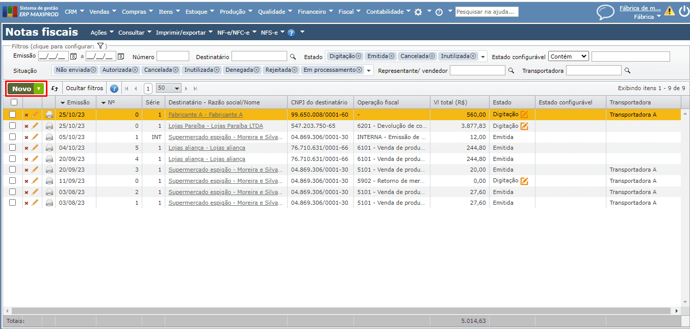 1) entre na página de “Notas Fiscais”, acessada pelo menu “Vendas > Notas fiscais” e clique no botão “Novo” para digitar a NF-e de devolução.