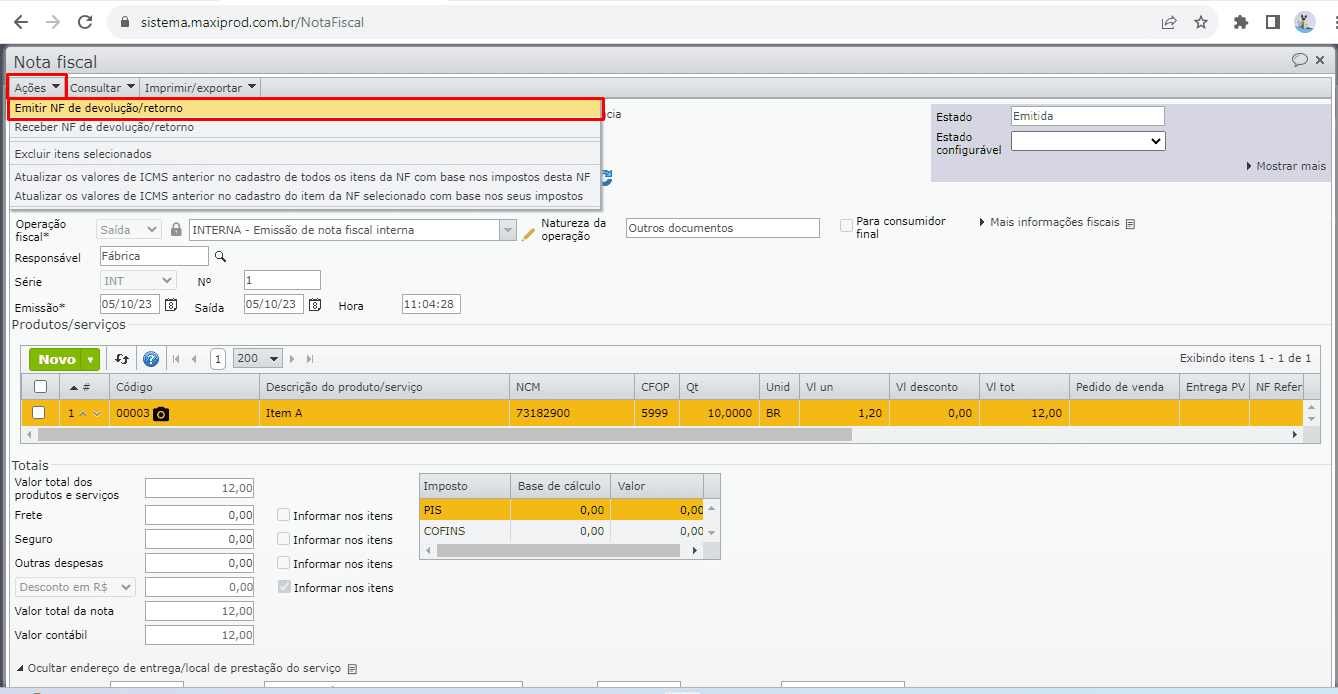 1) abra a NF-e emitida, da qual se quer gerar a devolução.