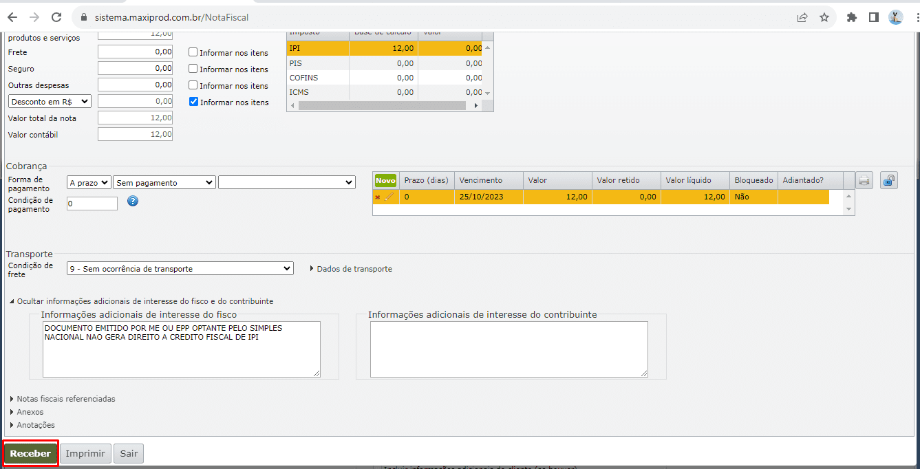 7) A seguir, clique no botão verde “Receber” para efetivar as movimentações e lançamentos referentes à devolução da venda.