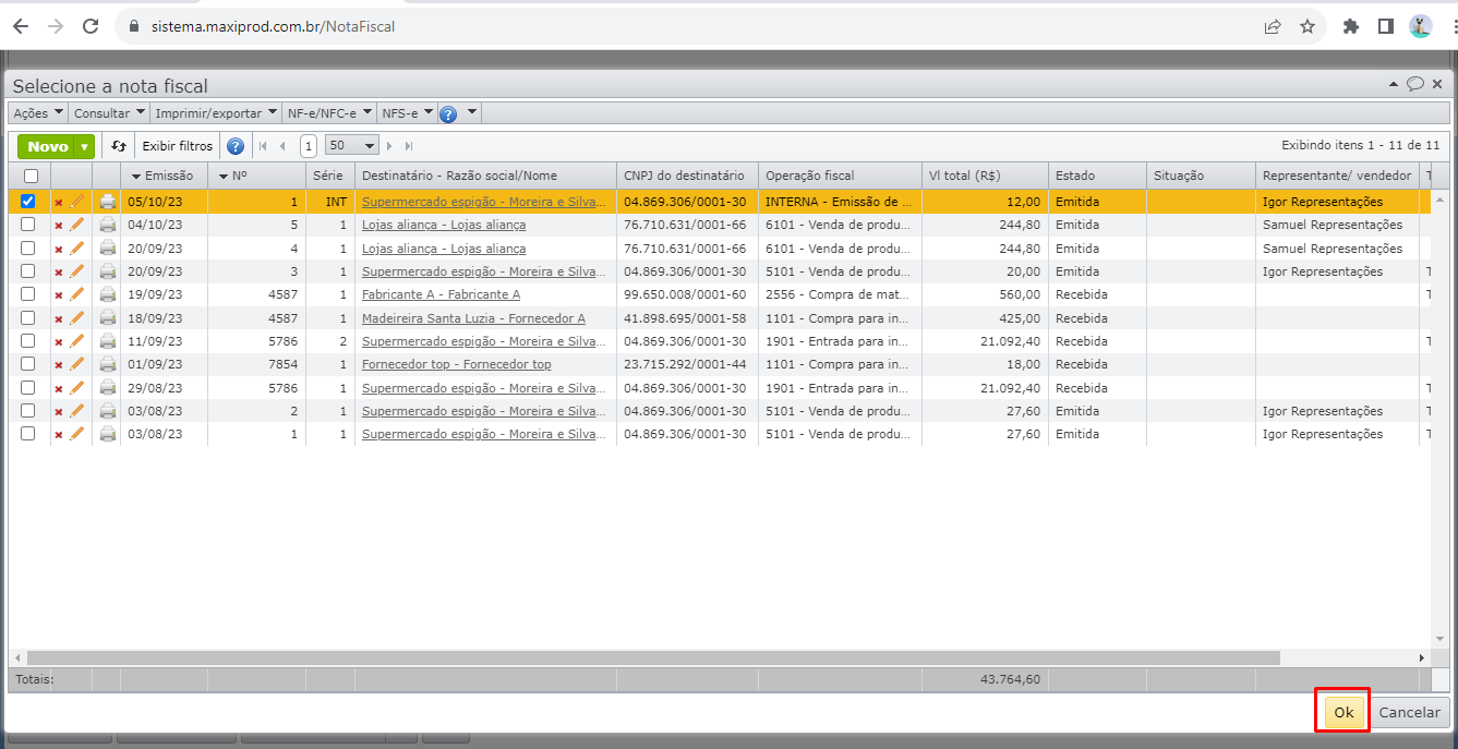 b) selecione as NFs referenciadas e clique em “Ok” no canto inferior direito da janela aberta.