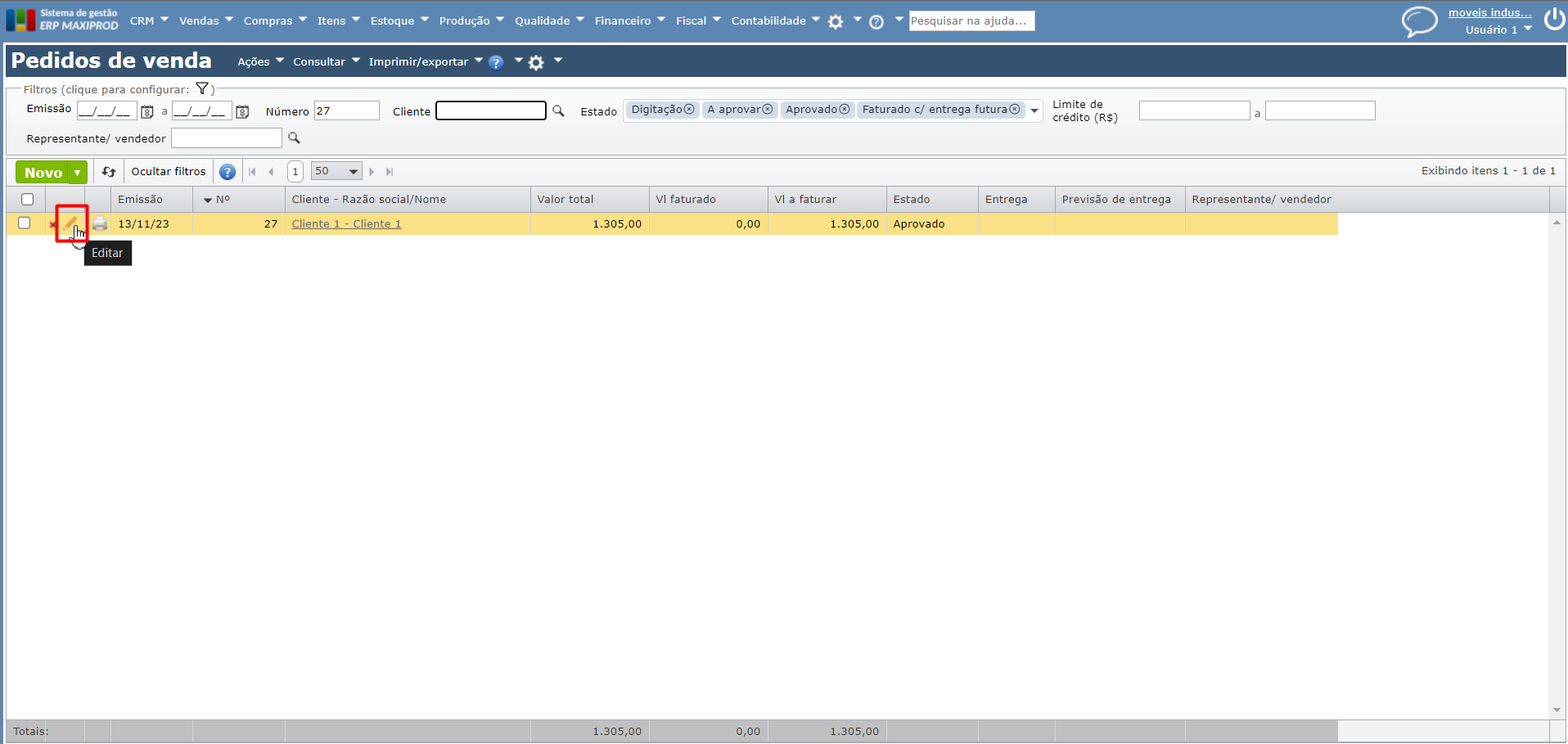 2) Identifique o pedido a faturar e clique no ícone “lápis laranja” para abrir sua edição.