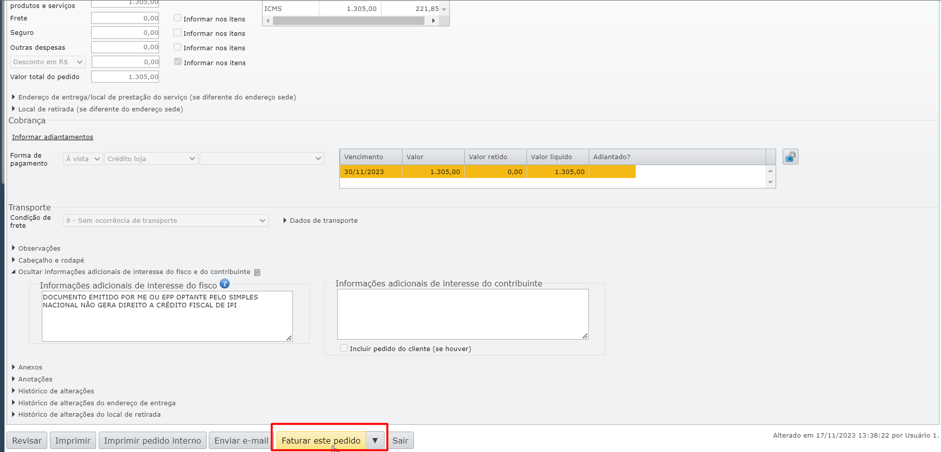 3) A seguir, vá até o final da tela e clique no botão “Faturar este pedido”.