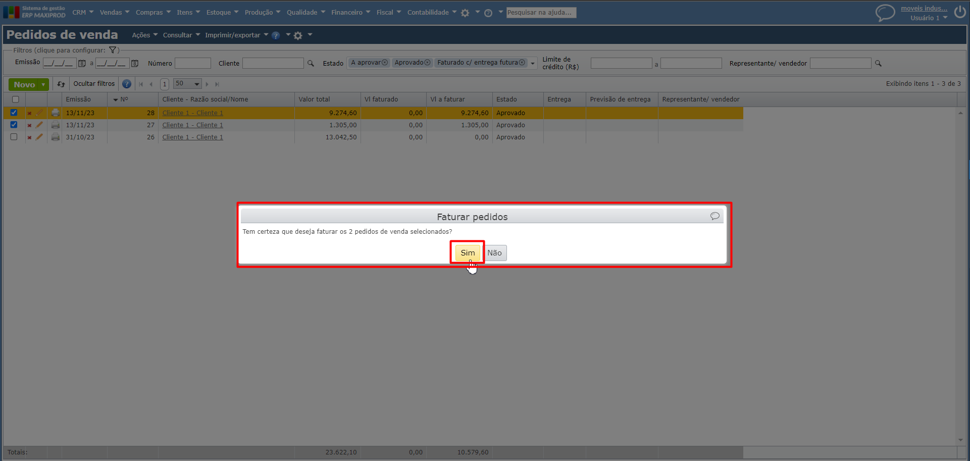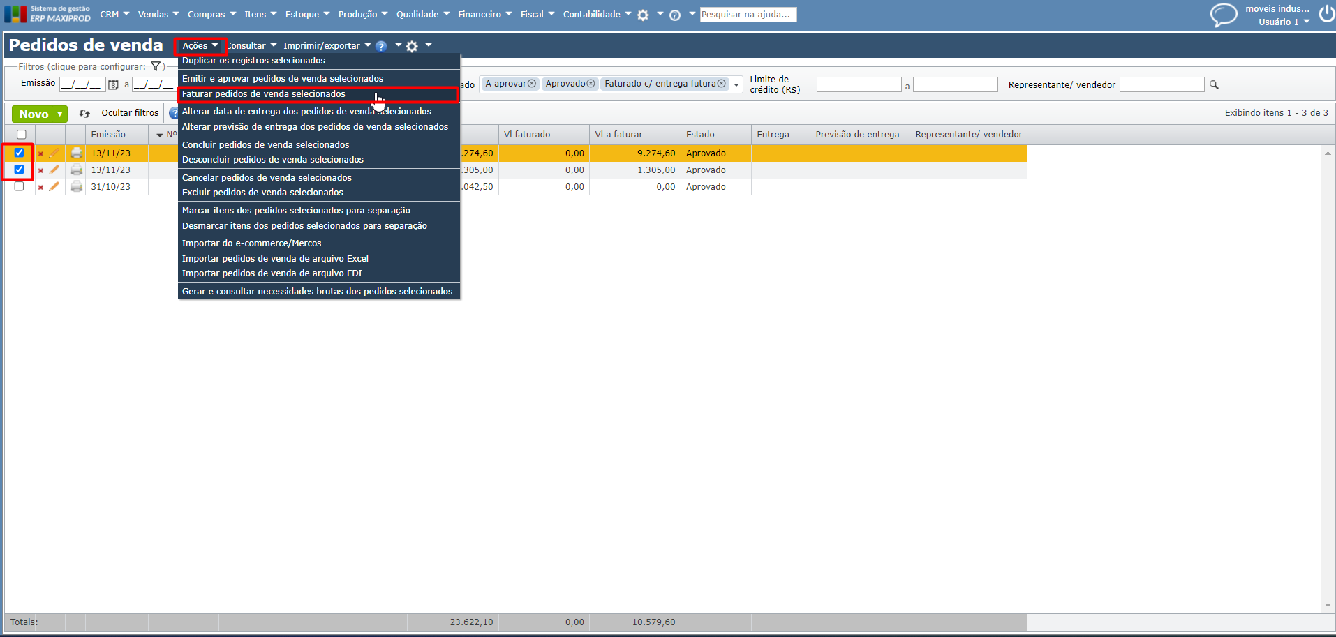 a) Selecione os pedidos que serão faturados através da caixa de seleção e acesse o menu “Ações > Faturar pedidos de venda selecionados”.