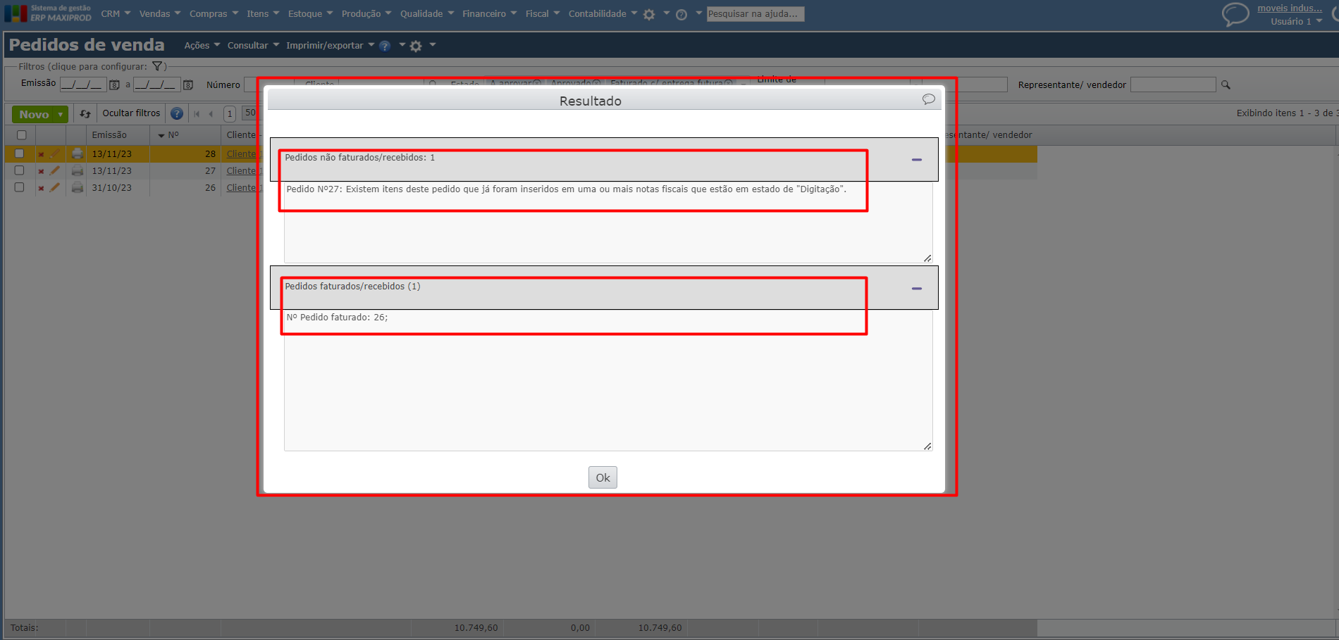 c) A seguir, é exibida uma mensagem de “Resultado”, contendo as informações dos pedidos faturados ou não, e os respectivos motivos.