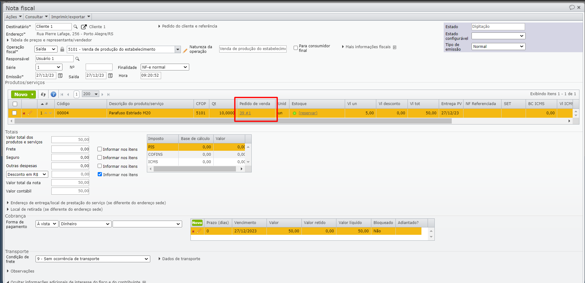 4) É aberta a tela de edição da NF gerada a partir do pedido. O vínculo entre os itens e o pedido estará visível na coluna “Pedido de venda“, como mostra a imagem abaixo.