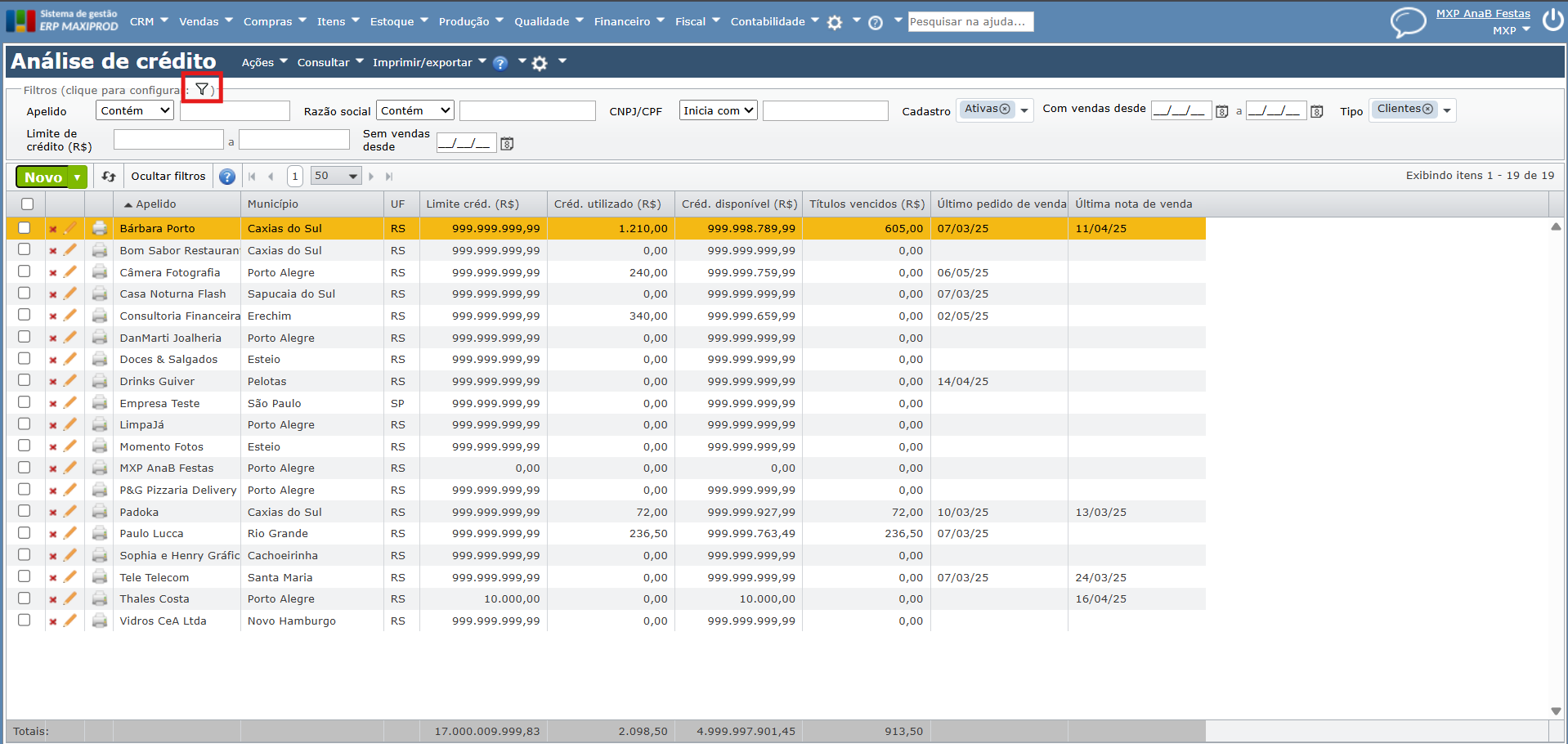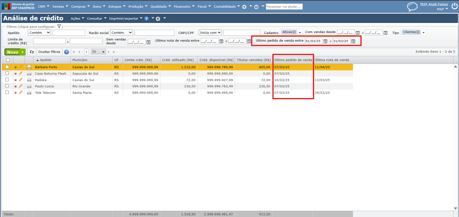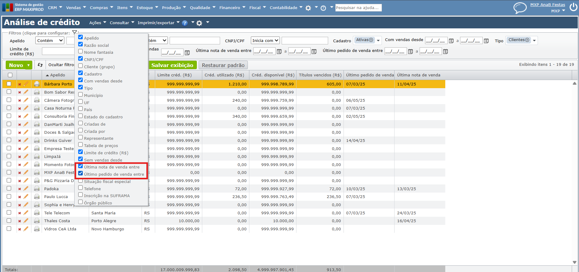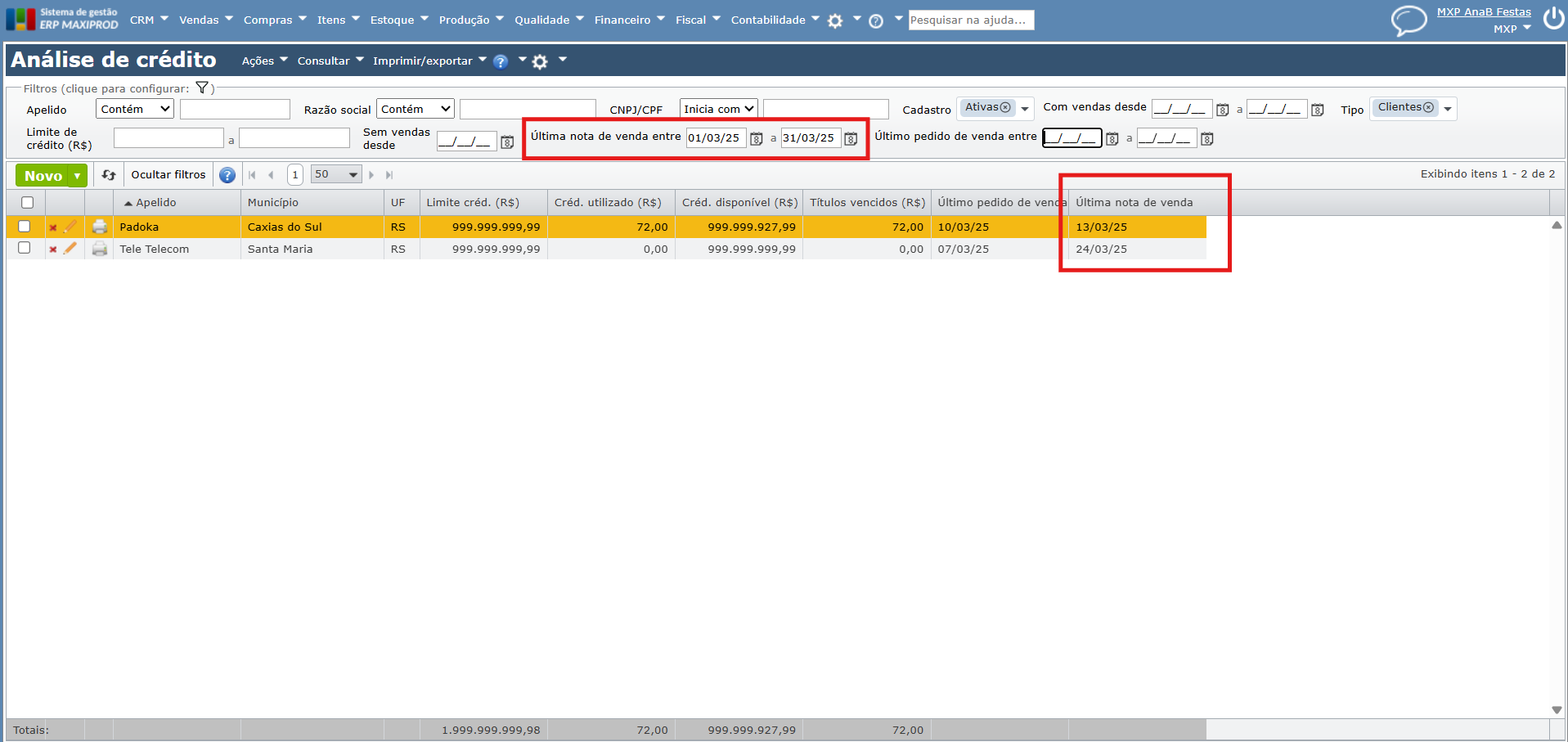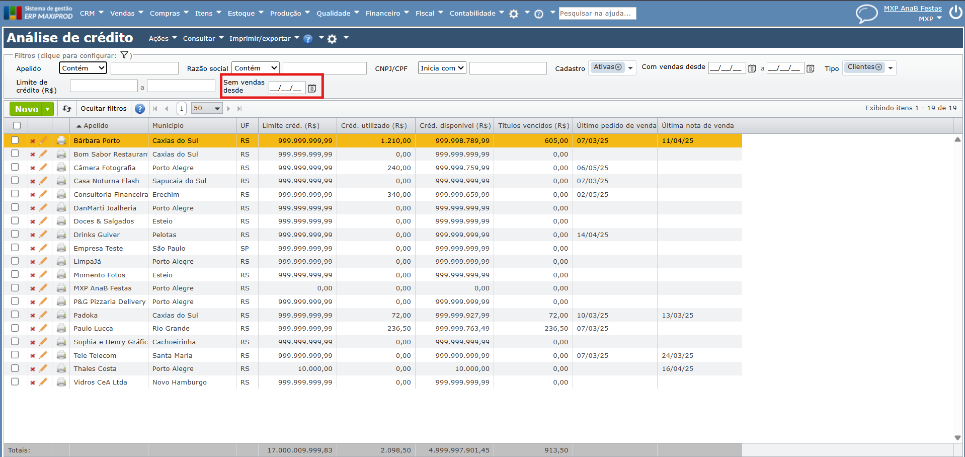 Manter o controle sobre o histórico de compras dos clientes é fundamental para uma gestão comercial eficiente. Com os filtros “Sem vendas desde”, “Último pedido de venda entre” e “Última nota de venda entre” disponíveis na tela de “Análise de crédito”, pode-se listar os clientes inativos em determinado período. Isto permite acompanhar o comportamento de consumo de seus clientes, e tomar decisões mais assertivas.