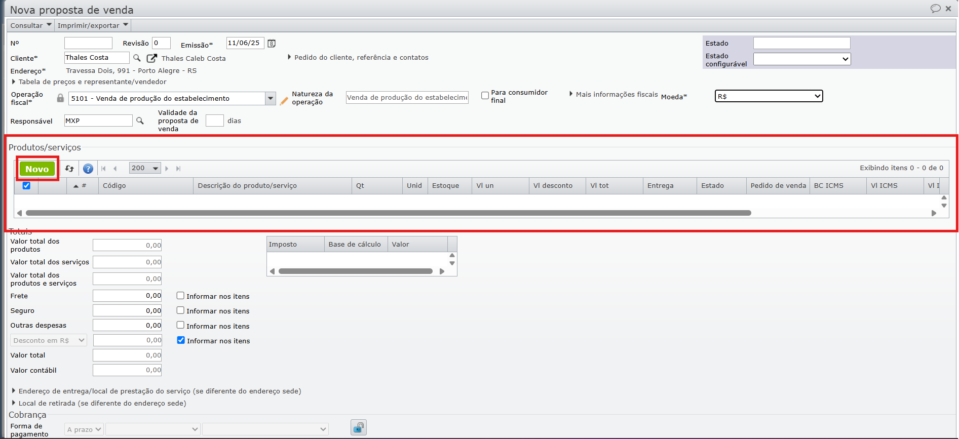 d) Na grade de “Produtos/Serviços”, clique no botão verde “Novo” para adicionar o item.