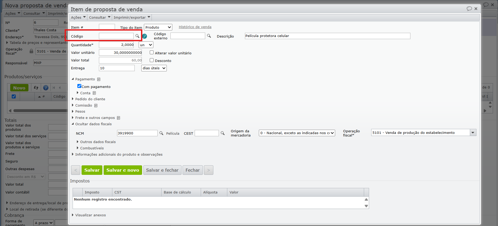 Observação: embora seja possível criar uma proposta de venda sem indicar um item cadastrado, o item precisa ser cadastrado ao avançar para o pedido de venda. Somente itens com código podem ser incluídos em pedidos de venda e notas fiscais.