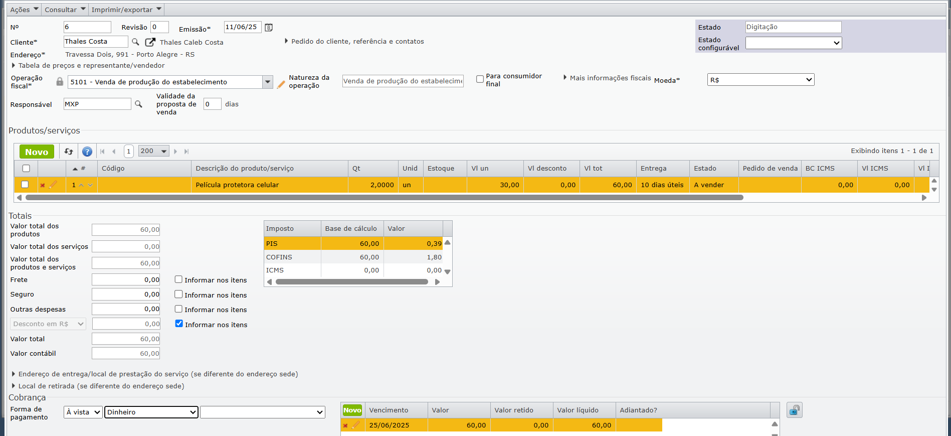 A proposta de venda é um documento utilizado para formalizar uma oferta comercial antes da concretização do pedido. Nela, são registrados os dados relevantes para a negociação, como informações do cliente, produtos ou serviços ofertados, valores, impostos, frete, prazos e condições de pagamento. A proposta de venda pode ser criada mesmo sem referenciar um item já cadastrado, oferecendo flexibilidade nas negociações iniciais.