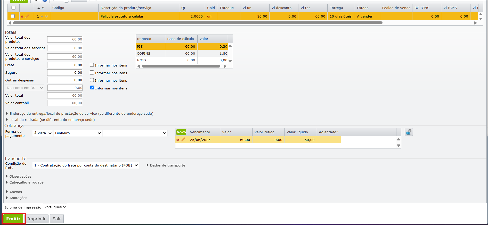 h) Após o preenchimento dos campos, clique no botão verde “Emitir”.