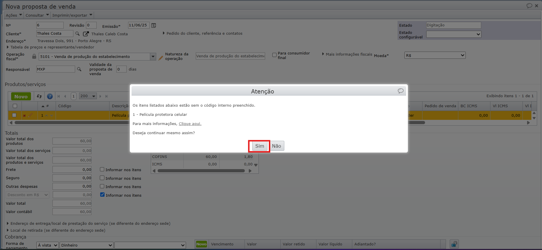 i) O sistema apresentará uma mensagem informando que o item está sem o código preenchido e perguntará se deseja continuar mesmo assim. Clique no botão cinza “Sim” para a proposta ser emitida.