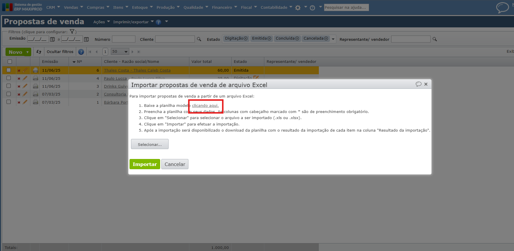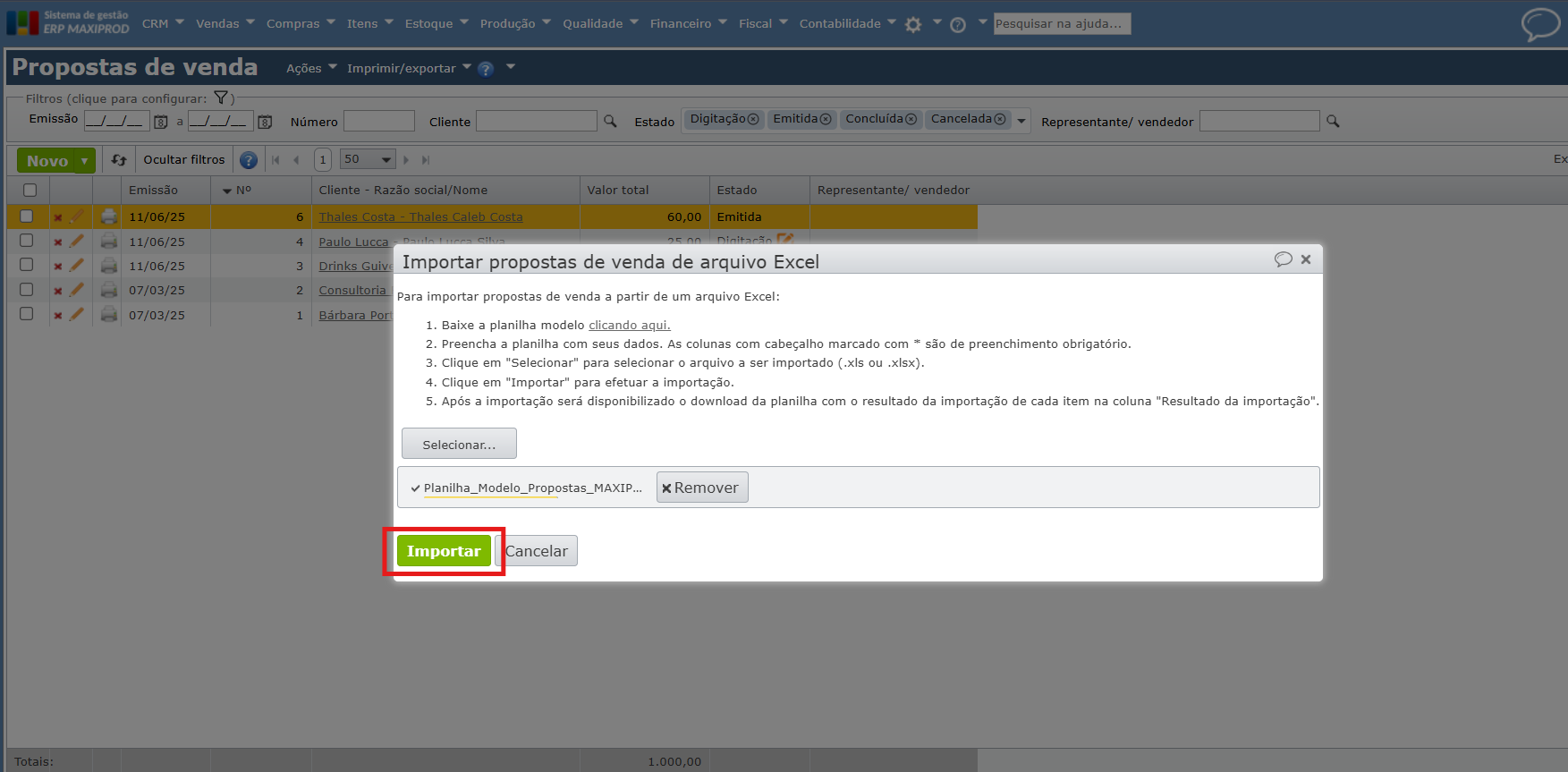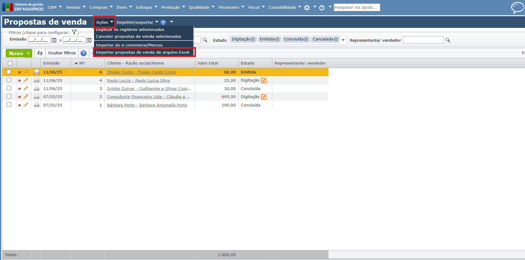 a) Para importar, vá para o menu “Vendas > Propostas”.