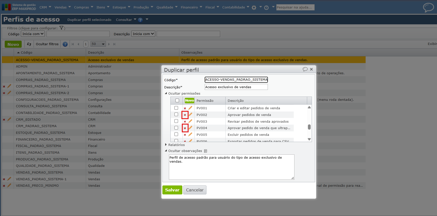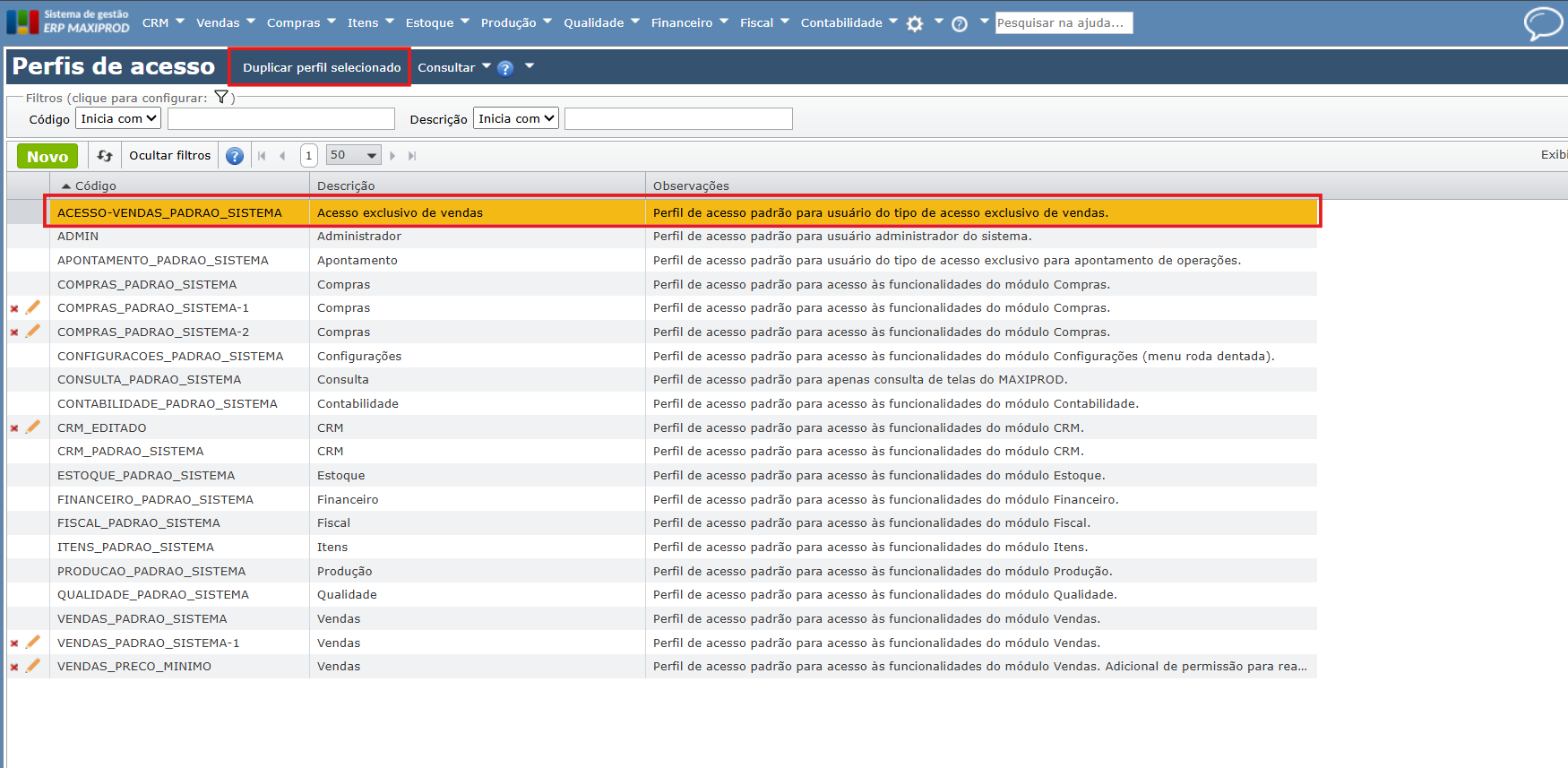 a) O sistema não permite a alteração de perfis de acesso padrão. Para isso, selecione o perfil de acesso desejado na tela de perfis de acesso, e vá para “Duplicar perfil selecionado”.