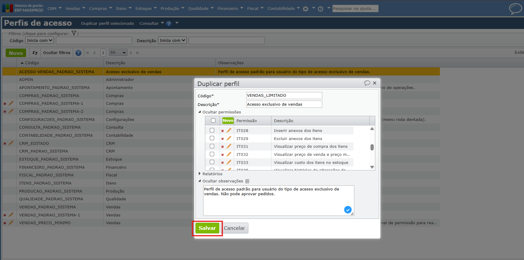 c) Salve o novo perfil de acesso (pode-se alterar o código e a descrição do perfil para facilitar a identificação).