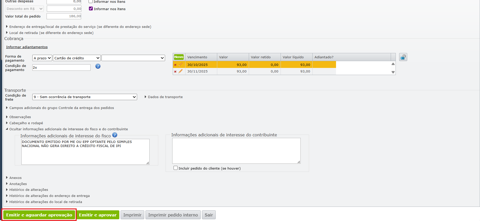 2) Se o usuário clicar em “Emitir e aprovar”, o pedido é emitido, mas aguardará a aprovação. É retornada a mensagem: