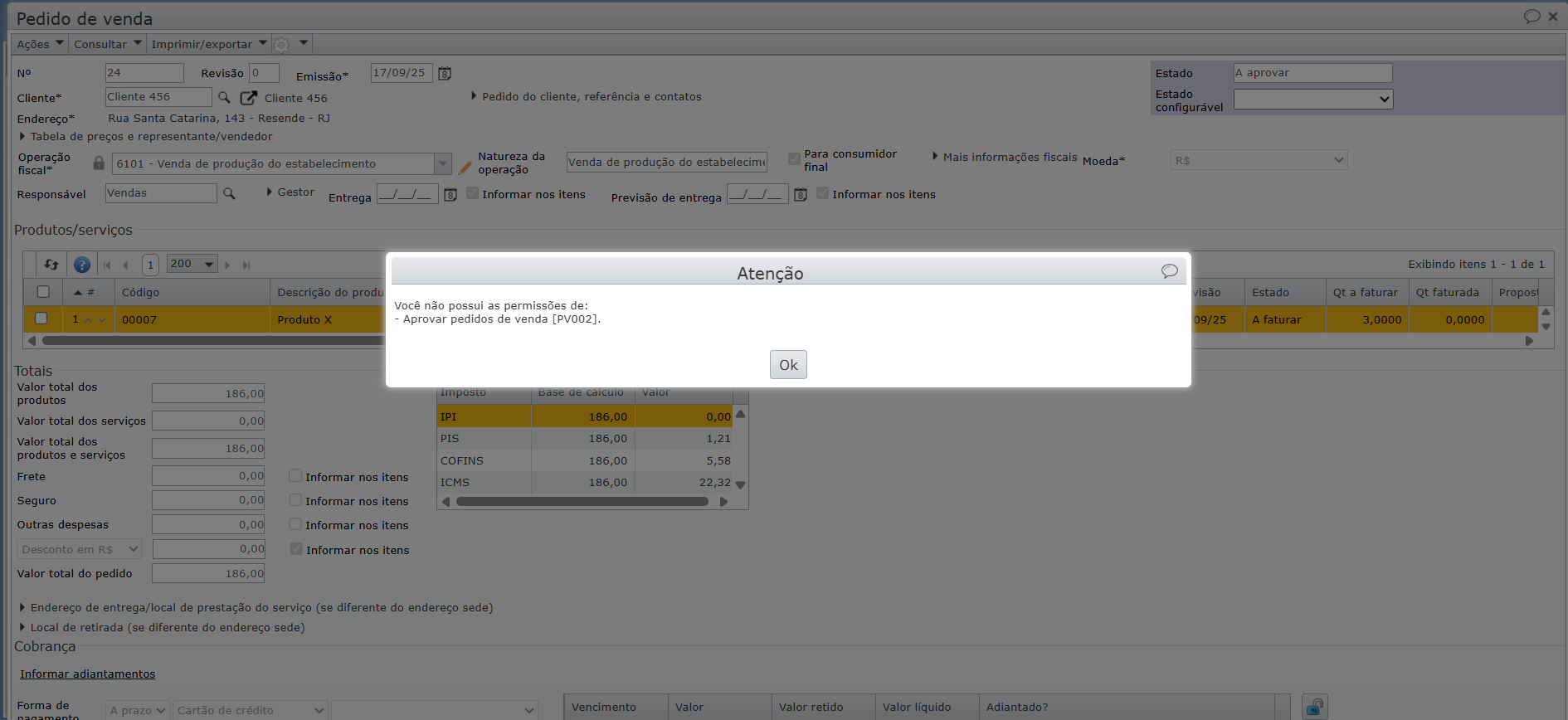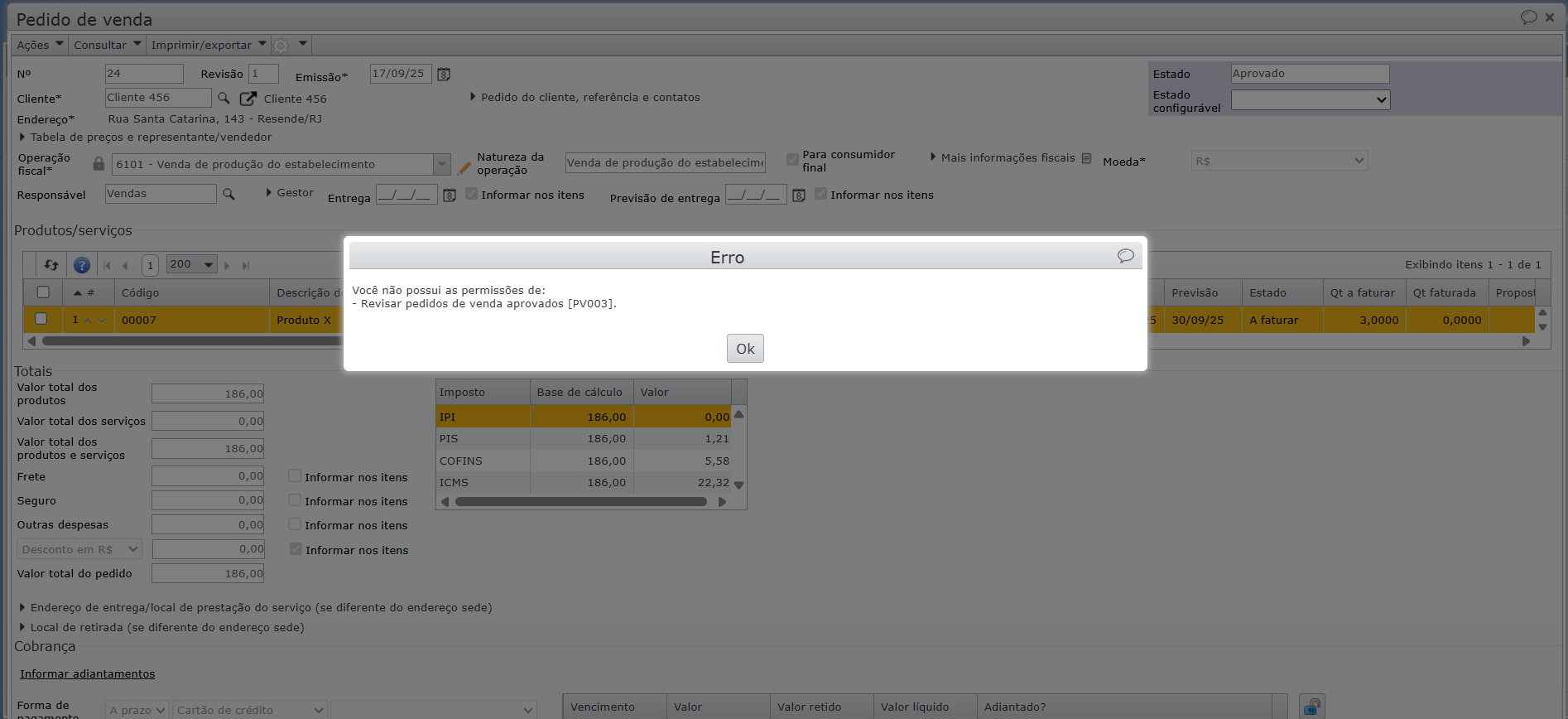2) Para revisar pedidos de venda aprovados, é necessária a permissão “PV003 – Revisar pedidos de venda aprovados”. A falta desta permissão impossibilita a reabertura de pedidos de venda por usuários não autorizados, após sua aprovação.