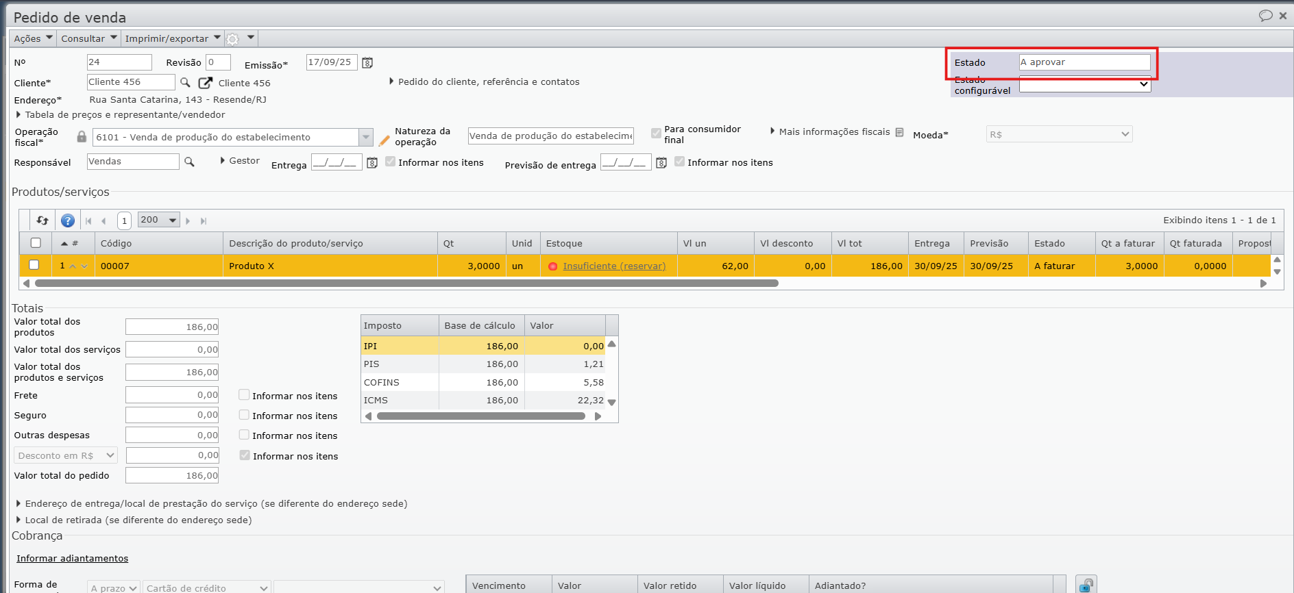 3) O pedido passa ao estado “A aprovar” e usuários com as permissões de aprovação poderão aprová-lo. Assim, apenas pessoas autorizadas farão aprovações, fortalecendo o controle interno.