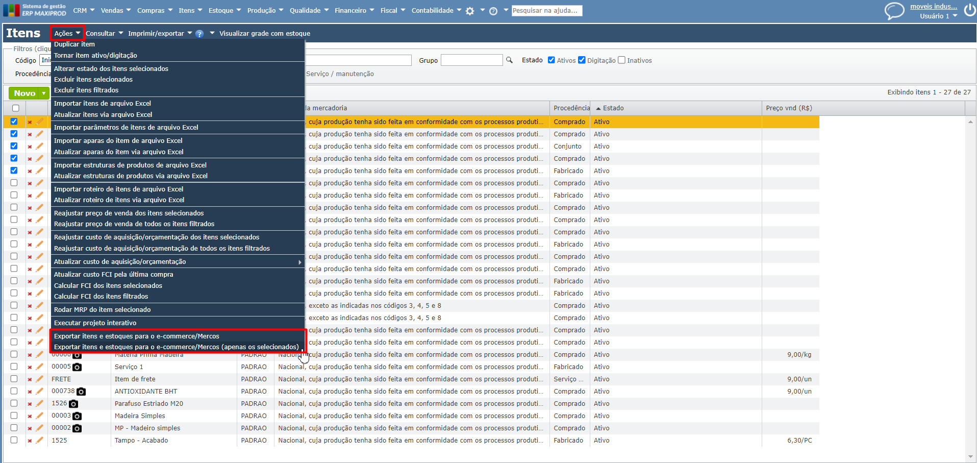 2) Na tela, selecione os itens que devem ter seu estoque exportado para o e-commerce/Mercos e acesse o menu “Ações” > “Exportar itens e estoques para o e-commerce/Mercos (apenas os selecionados)”. Também é possível exportar todos os itens e estoques para o e-commerce/Mercos, através da opção “Exportar itens e estoques para o e-commerce/Mercos”.
