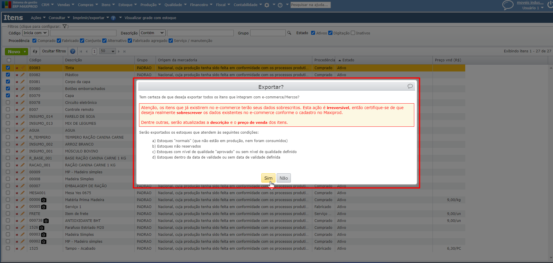 3) Ao utilizar as opções, é exibida uma mensagem de confirmação pelo sistema. Ao clicar em “Sim”, o estoque dos itens é exportado e atualizado no e-commerce.