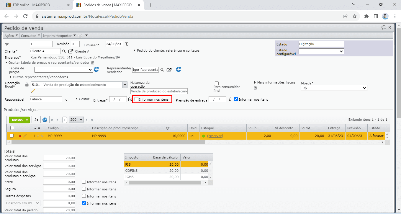 a. O campo “Entrega” do pedido de venda somente é editável se a opção “Informar nos itens” ao lado direito do campo, estiver desmarcada.