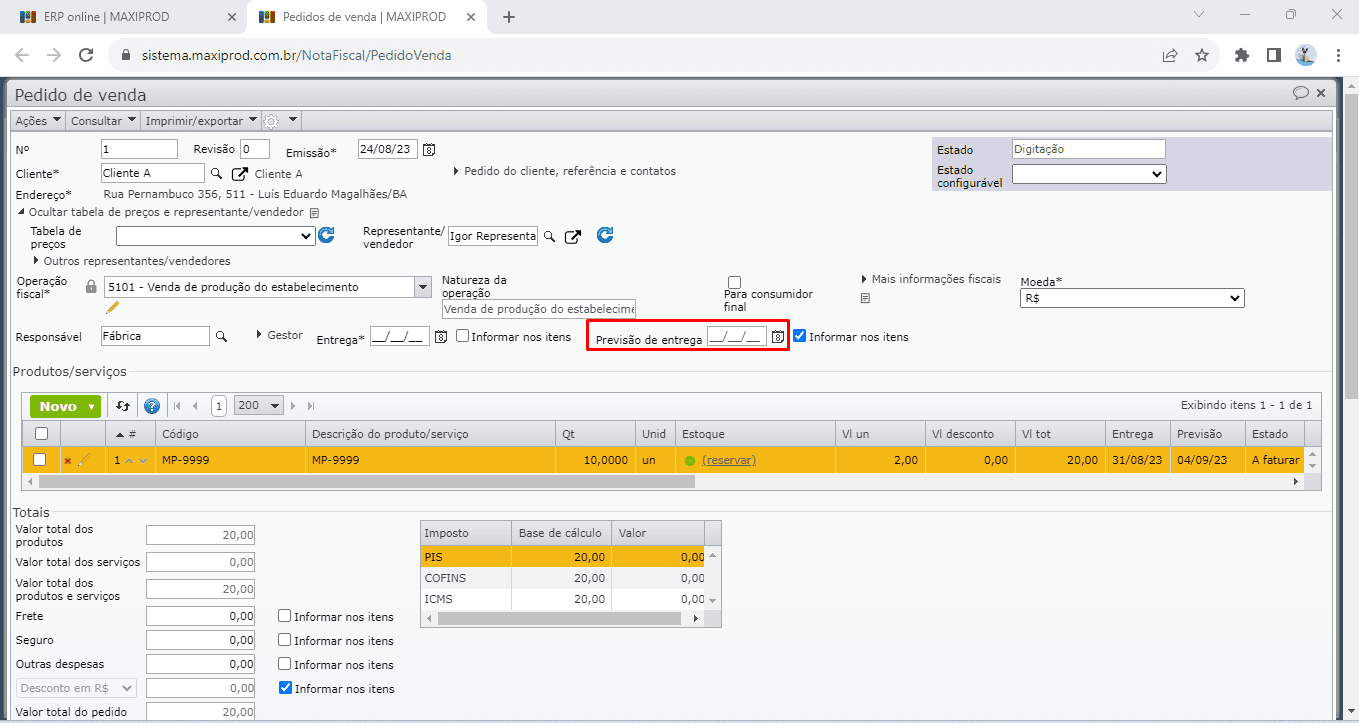 b. a data de Entrega do pedido de venda inicializa as datas de Entrega dos itens do pedido e serve como base para o cálculo das datas de necessidade das ordens de produção e solicitações de compra vinculadas a cada item do pedido.