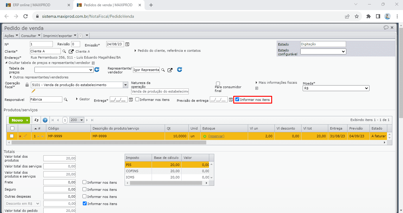 4) Para informar a “Entrega” e/ou “Previsão de entrega” diretamente no item do pedido de venda, é necessário que a opção “Informar nos itens” do respectivo campo do pedido esteja marcado.